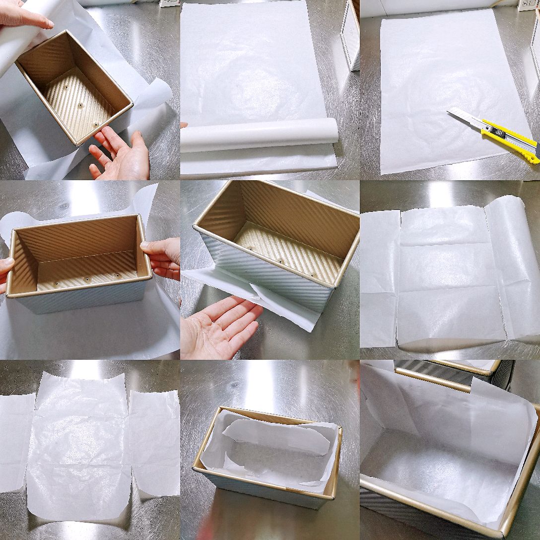 步骤1、先将吐司模具内铺油纸:1、拉开油纸,放入吐司盒,长对长宽对宽,两头油纸的高度与模具高度一致,一头用手指压出压痕2、拿走模具,顺手把油纸卷那头反方向折过来(反过来更容易折),根据压痕折出长度3、根据折痕裁剪出油纸4、将裁剪好的油纸铺在模具下方,四边对齐,沿着模具底部四边用手指压出压痕5、拿走模具,再根据四边的压痕折起来,折出来的中间形状就是模具的底面,四面则是模具的四边6、打开油纸,沿图中方向剪开四条线7、如图沿着四条线,将两侧油纸剪短一点8、将油纸放入模具,铺好即可