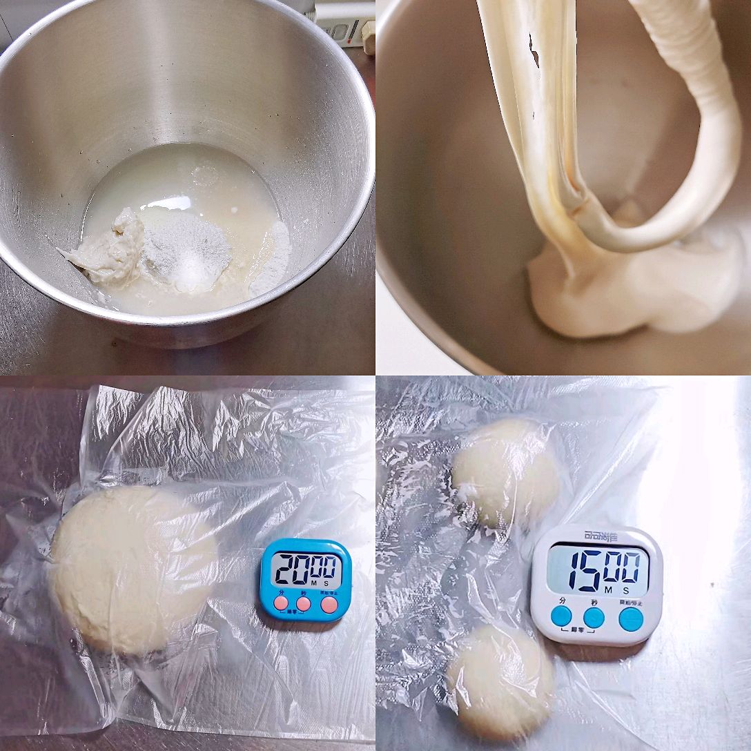 步骤2、以下为乔立7600揉面步骤:1⃣、除黄油和酵母外,所有材料入桶揉面,2档2分钟,转4档6分钟加黄油,再4档6分钟后加鲜酵母,揉至接近完全扩展,约18分钟2⃣、盖保鲜膜醒面20分钟3⃣、称重、平均分2个团、揉圆后盖保鲜膜醒面15分钟