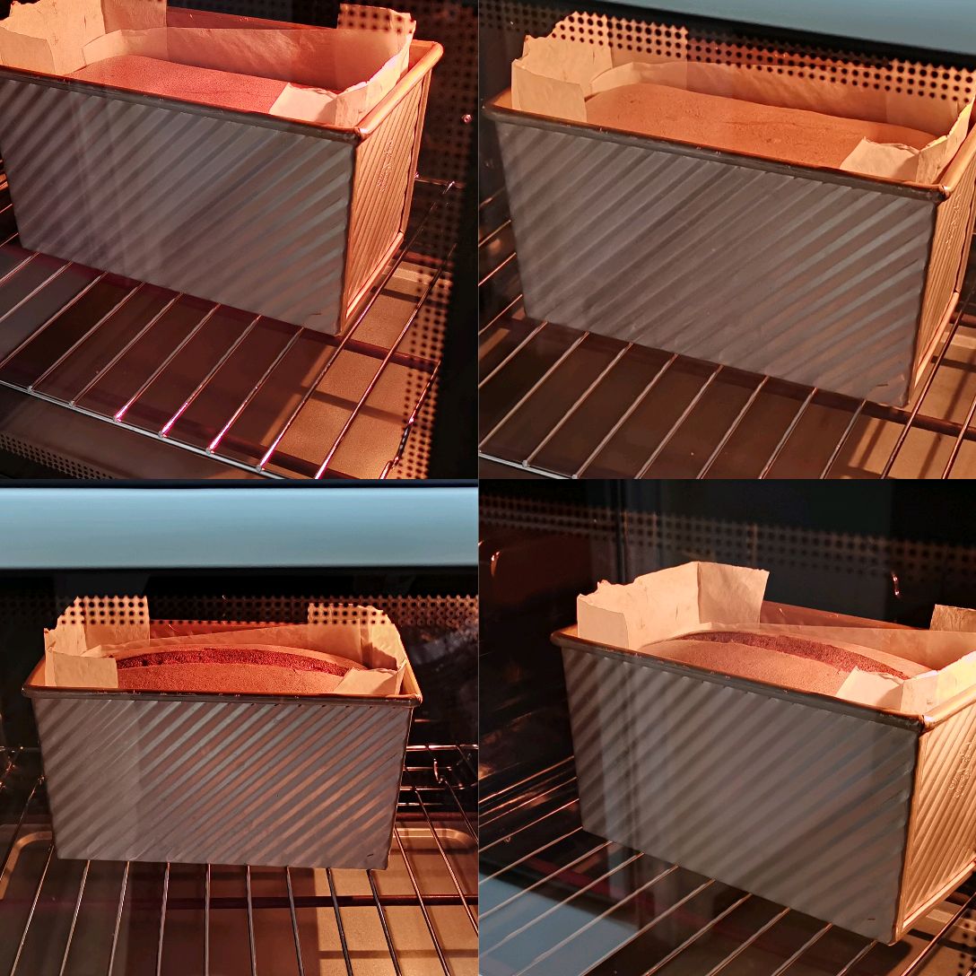 步骤3、4⃣、擀成长约23-24公分,宽约16公分的长方形,卷起入模,(入模后面团基本顶住两头才会往上长,若面团较短则会往两侧长,面团不会往上拱起),❗️卷起后接缝处居中,使整个面团压在三个排气孔上,且轻按使其稳固5⃣、发酵温度35度左右,湿度75%左右,发酵至1.5倍大6⃣、发酵到1.5倍大时开始准备蛋糕部分,大概是发酵20-25分钟左右,一定要看状态判断,若没有达到1.5倍大就继续发酵,直至1.5倍时操作蛋糕部分