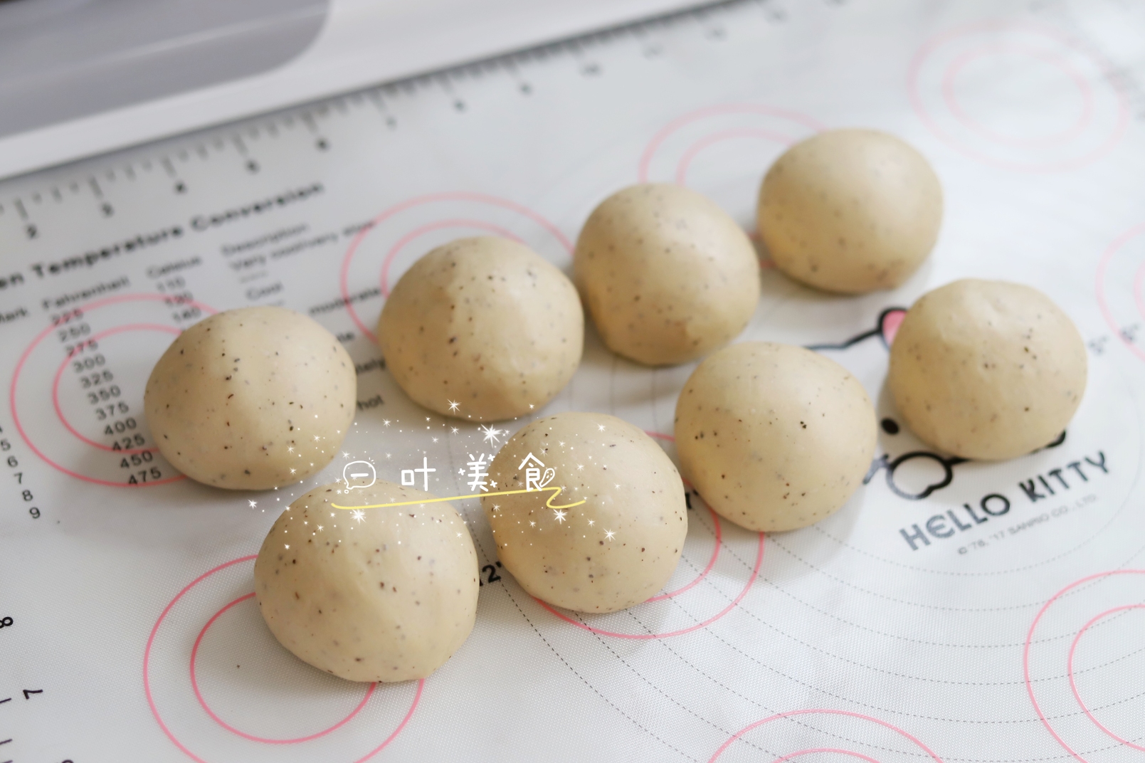 步骤12、温度35℃,湿度75%发酵8分满。刷蛋液,中间剪一刀,撒酥粒(也可不加)。