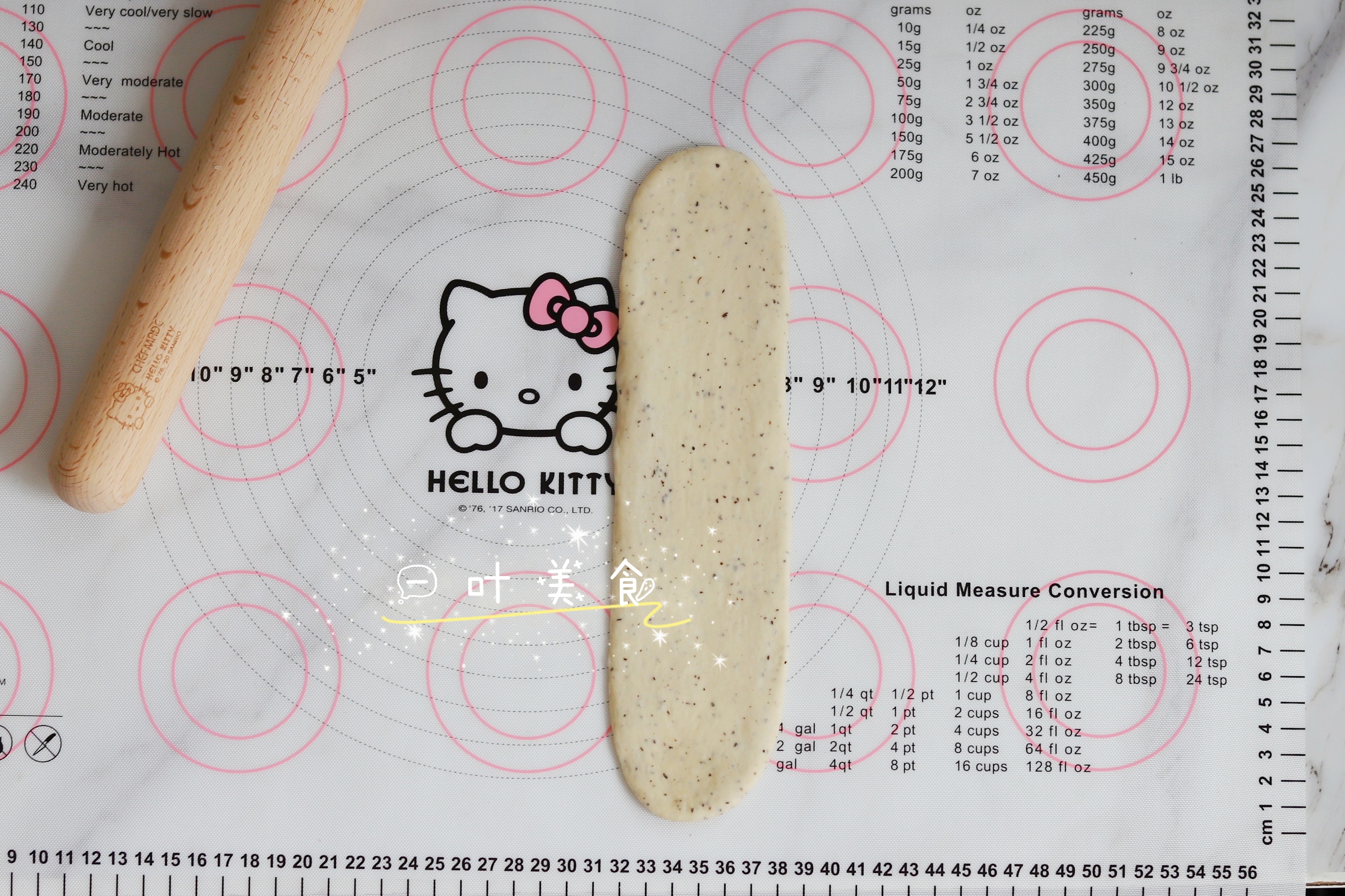 步骤9、翻面90度,底下压薄,抹上奶酥馅。奶酥:黄油软化加糖搅均匀,分次加蛋液。加入奶粉、红茶拌匀。