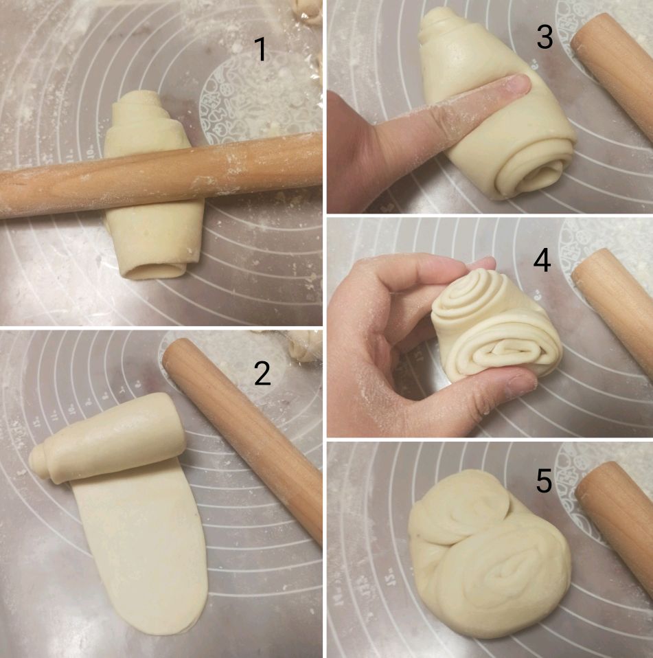步骤5、【醒好后取出第二次擀成牛舌状再卷起来按照上图步骤擀成酥饼皮准备包豆沙馅了】❗步骤1是从中间往两端擀成牛舌状这样做防止乱擀中间有空气进入会容易破皮这时候每层皮都很薄了哈哈❗豆沙酥皮不要太厚擀薄一点2-5㎜(目测哈哈)不然太厚了中间不起酥我就是把豆沙酥皮擀厚了中间软软的哈哈好在外面3-5层起酥了口感还可以