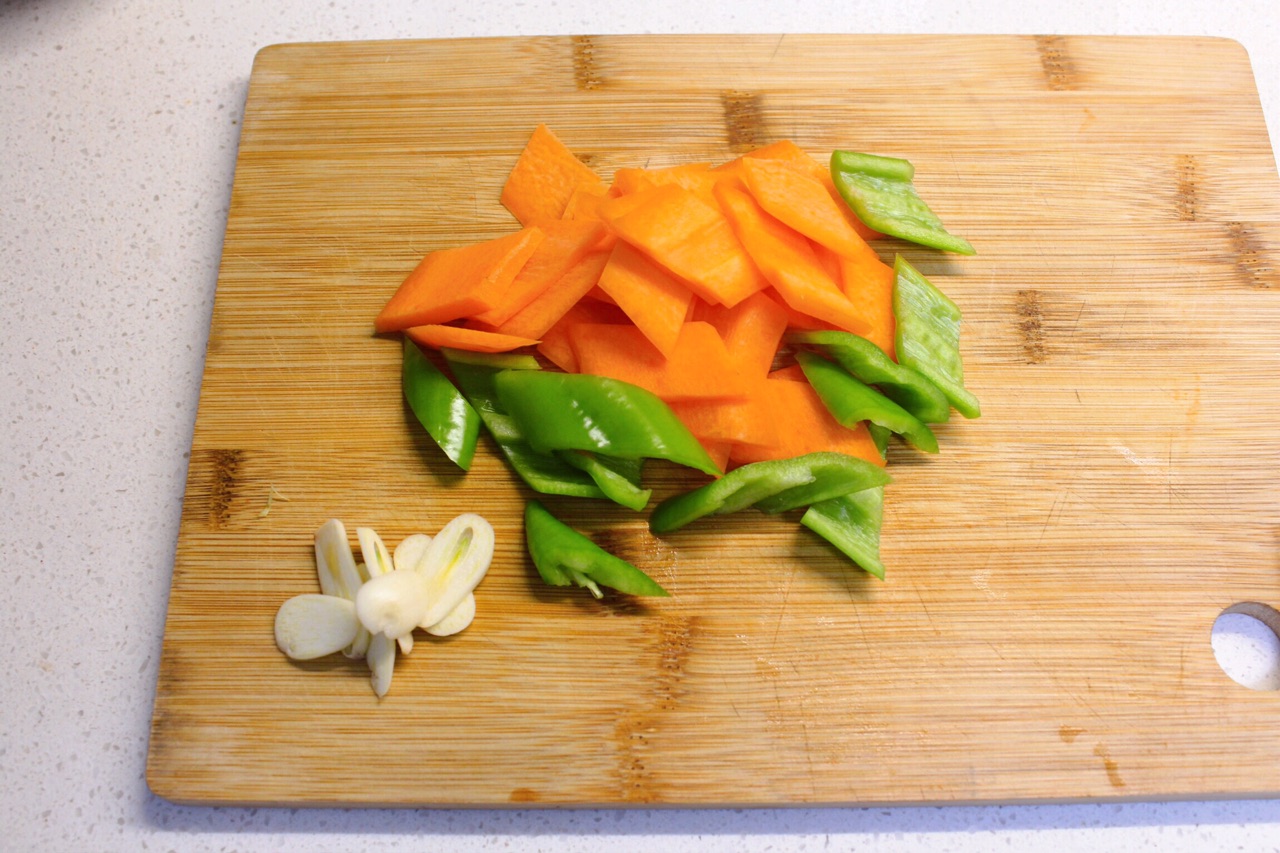 步骤2、胡萝卜和尖椒切成片,蒜切片备用;