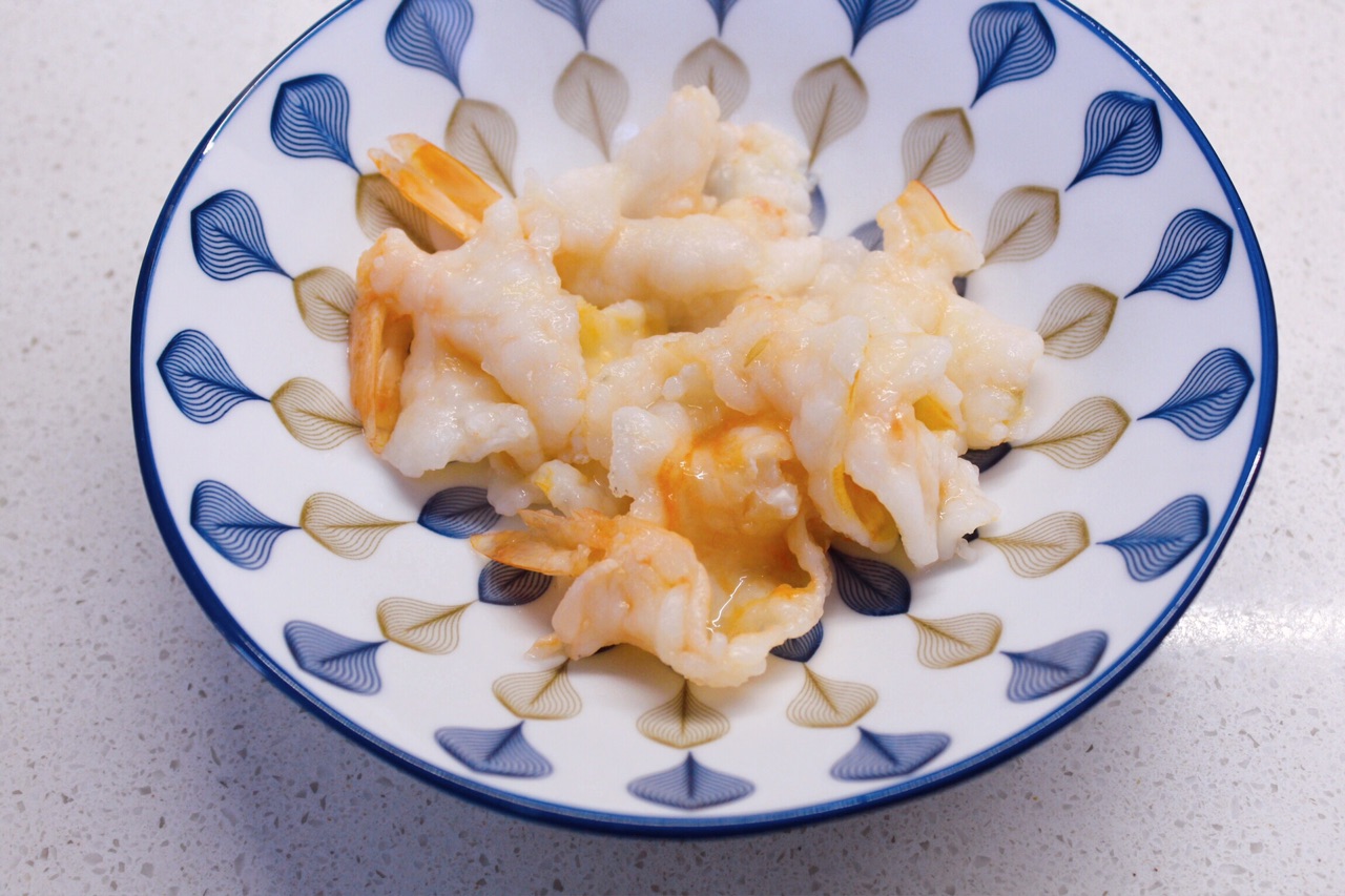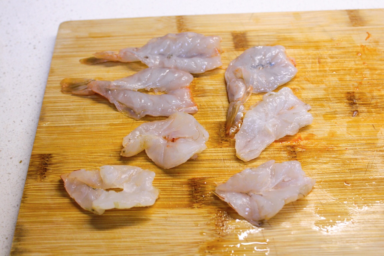步骤3、制作敲虾:将虾仁从中间片开,去虾线后平展放置;