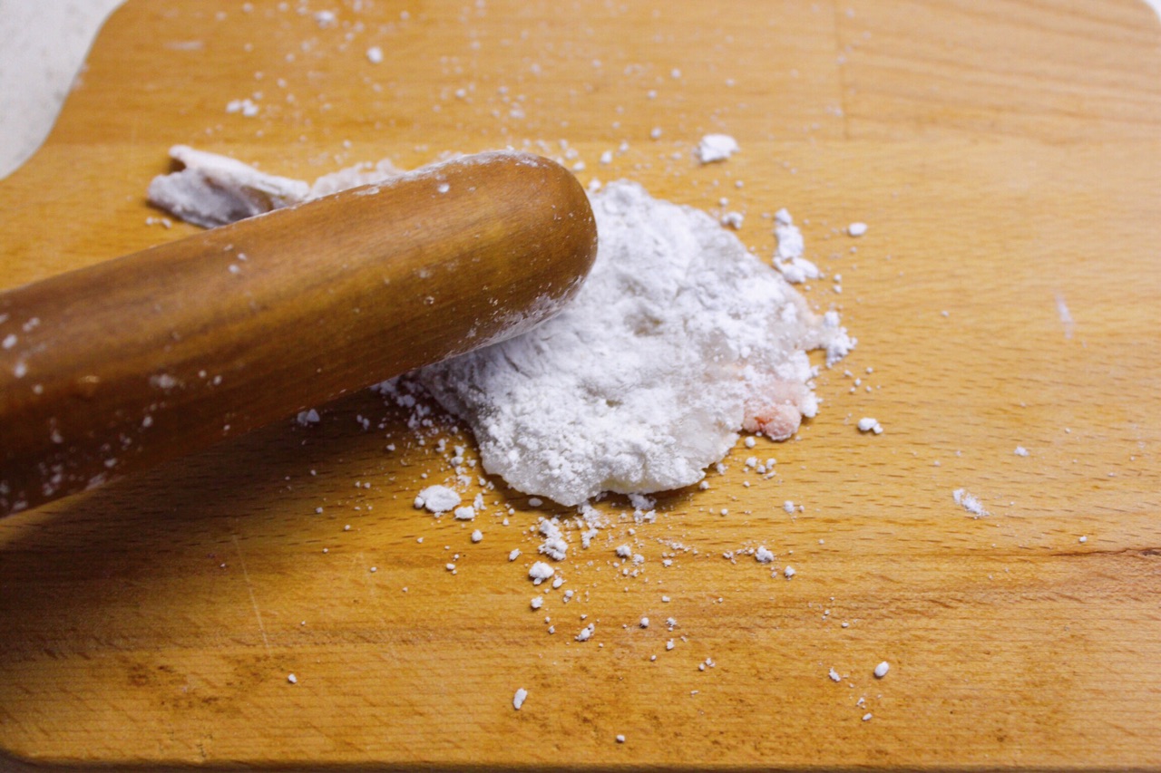 步骤4、放1勺淀粉在虾上,然后用擀面棍敲打虾肉使其平整变薄,淀粉少了露出虾肉再补一些淀粉继续敲打;