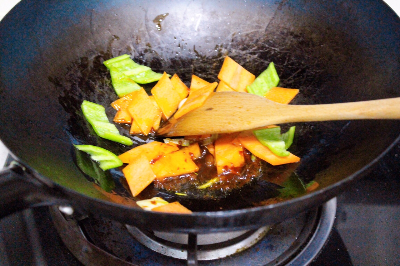 步骤9、放入胡萝卜片和尖椒片,炒至断生;