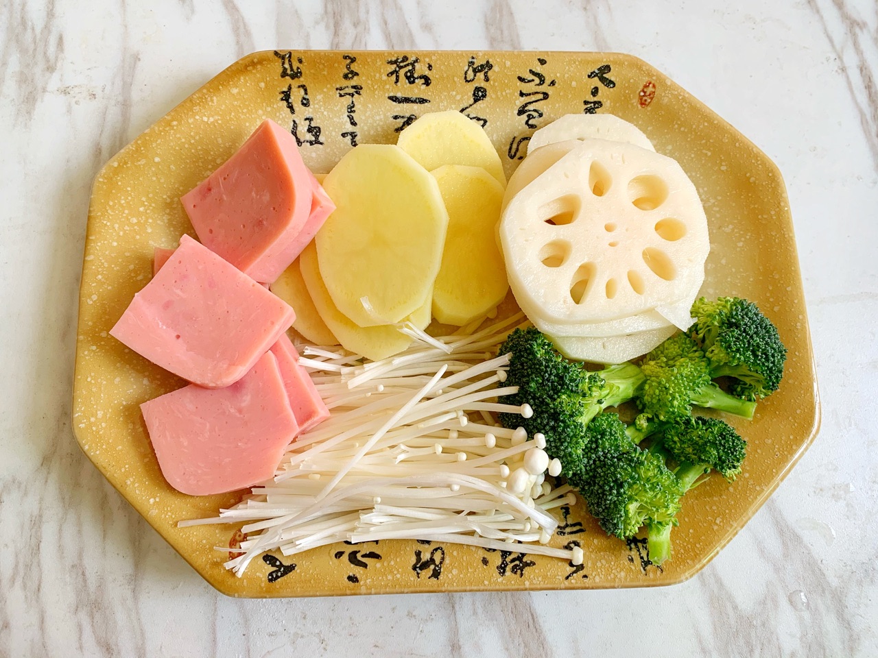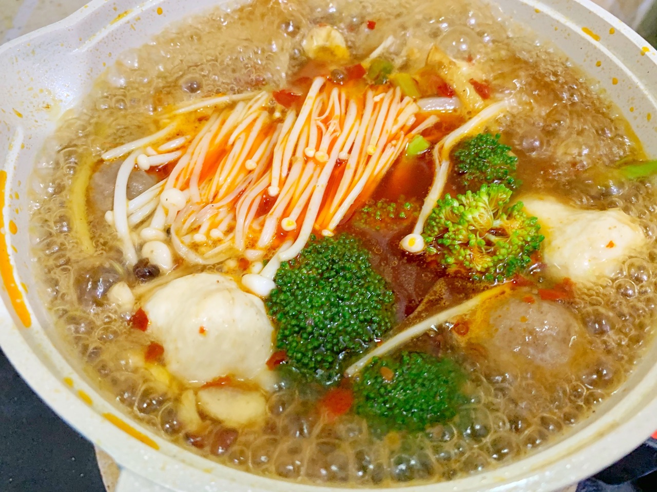 辅料:金针菇50克、西兰花少许、土豆半个、藕片4片、肉丸10颗、小石窖火锅底料1罐、姜2片、蒜2瓣、葱3根、香菜1根、小米椒1个