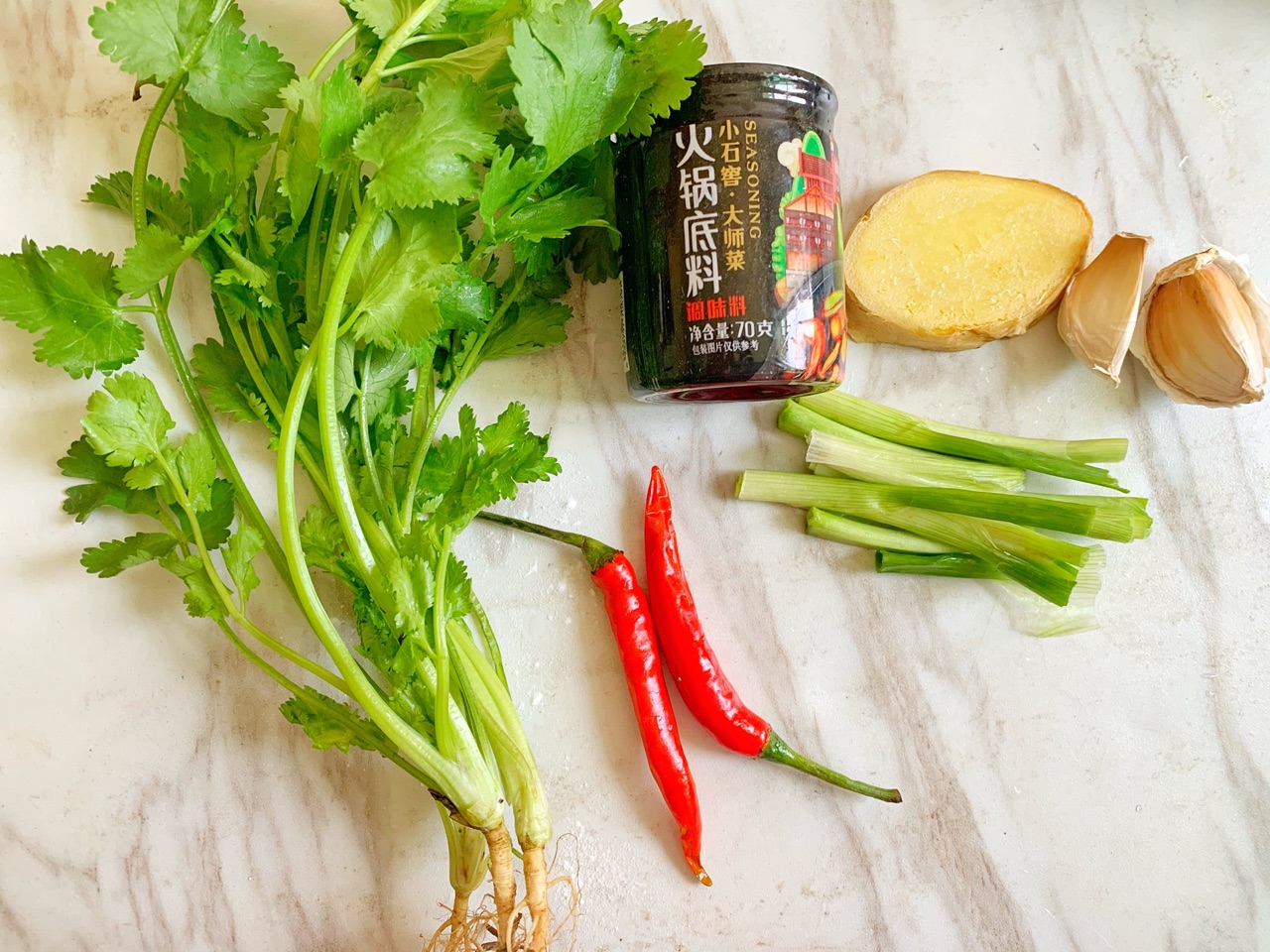 步骤2、香菜,小米椒,葱,蒜,姜,小石窖火锅底料。