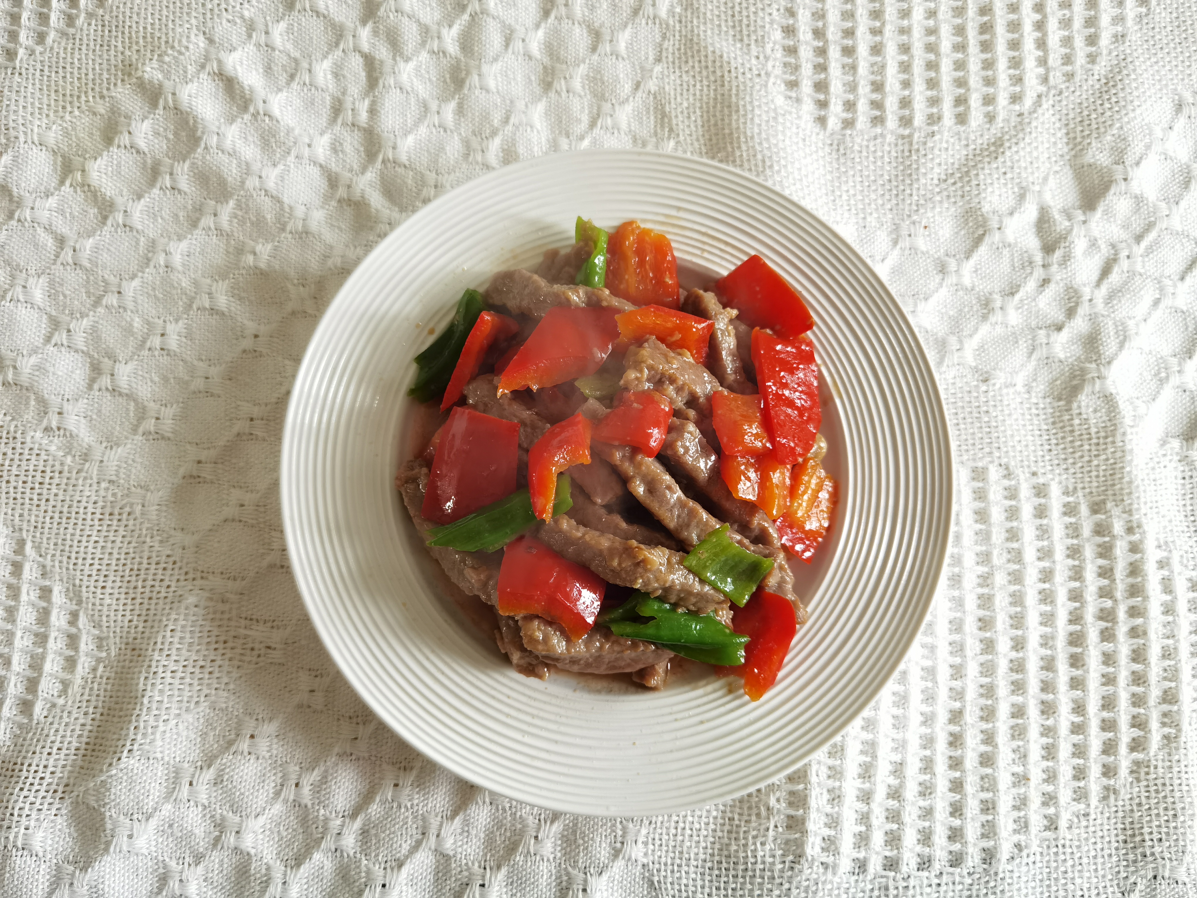 步骤1、牛年吃牛肉,牛转钱坤,好吃寓意又好,新年菜可以安排一下。准备材料,牛肉切成长条,清洗干净备用。青红椒去柄去籽切成小块备用。
