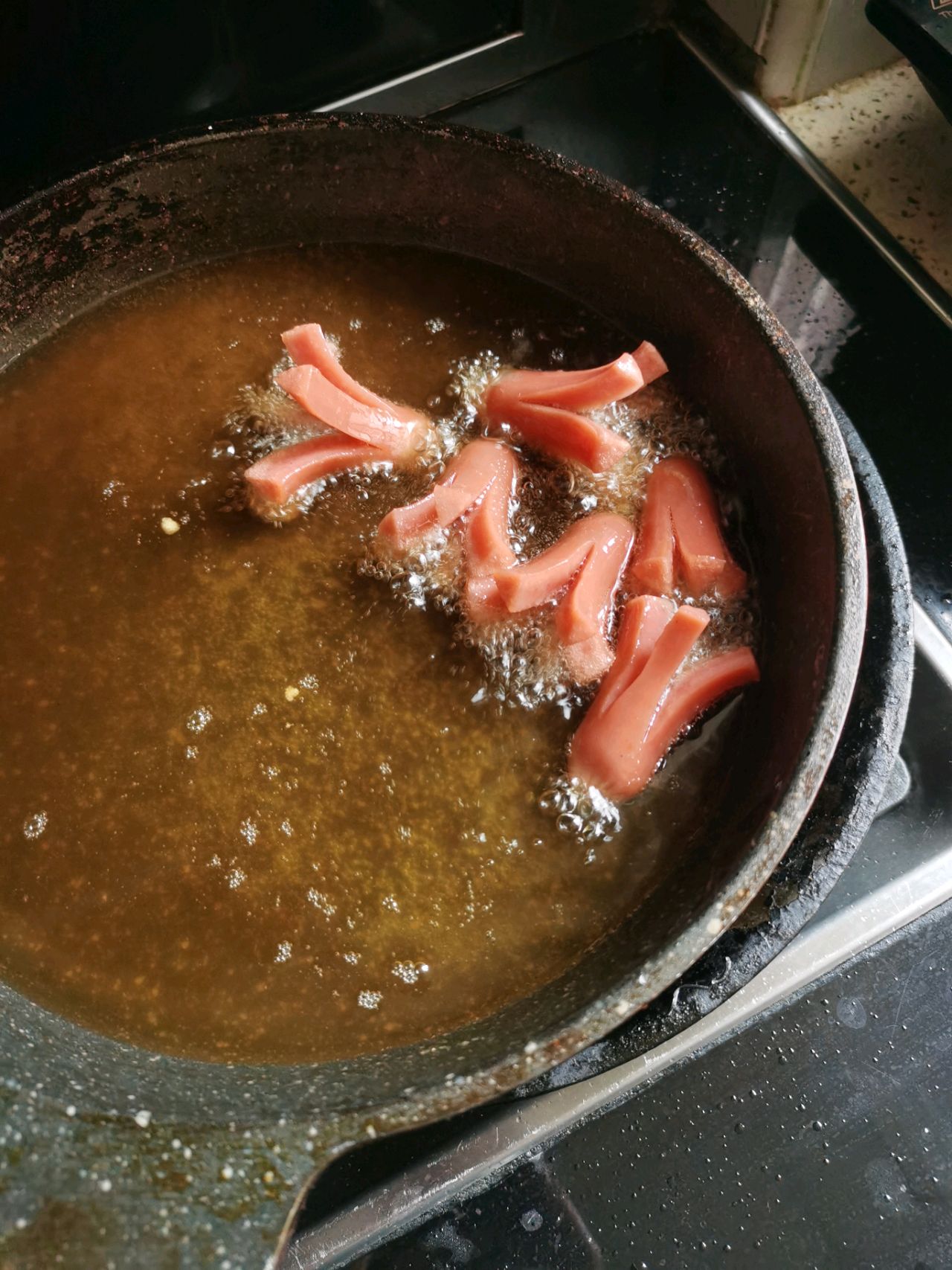 步骤1、香肠三根对半切开,切成成六瓣,入油锅炸开花