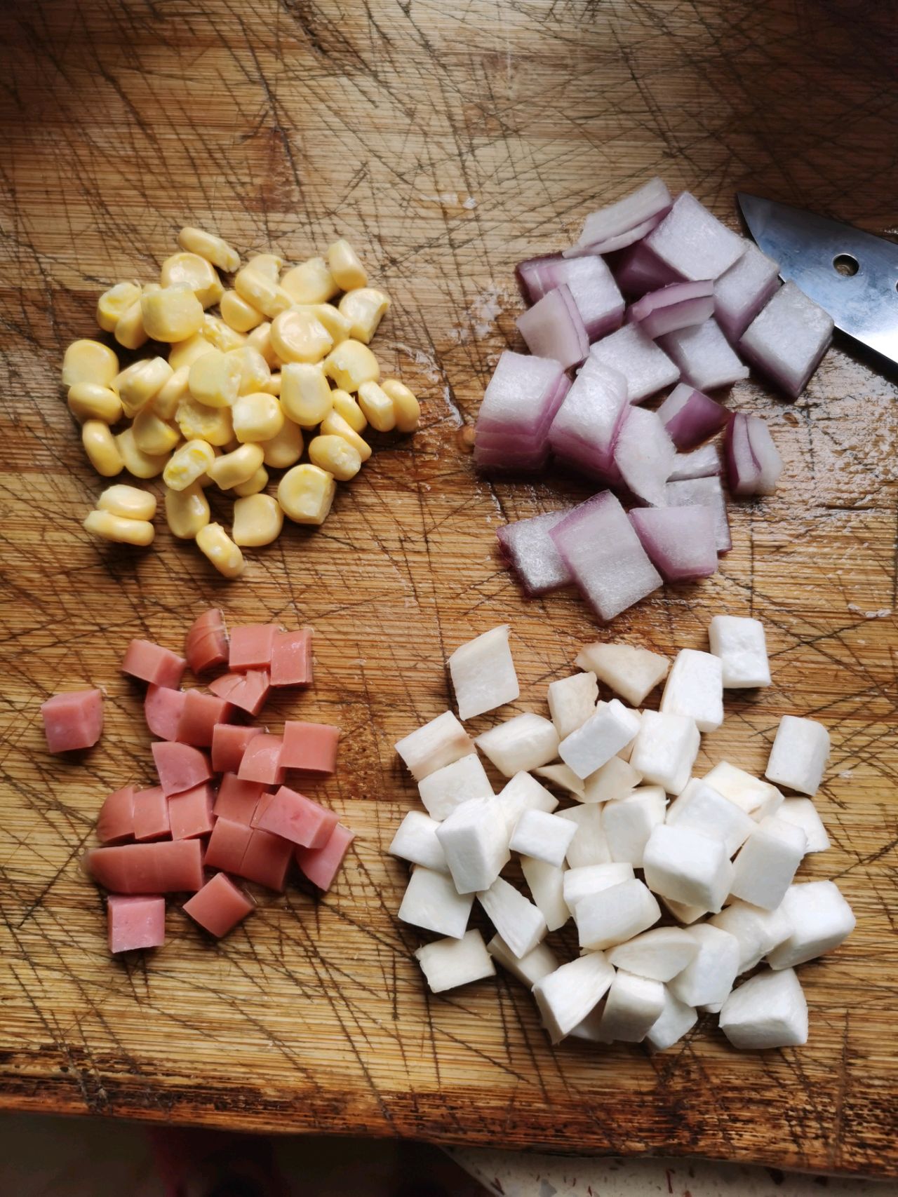 步骤4、香肠一根切丁,杏鲍菇,洋葱切丁