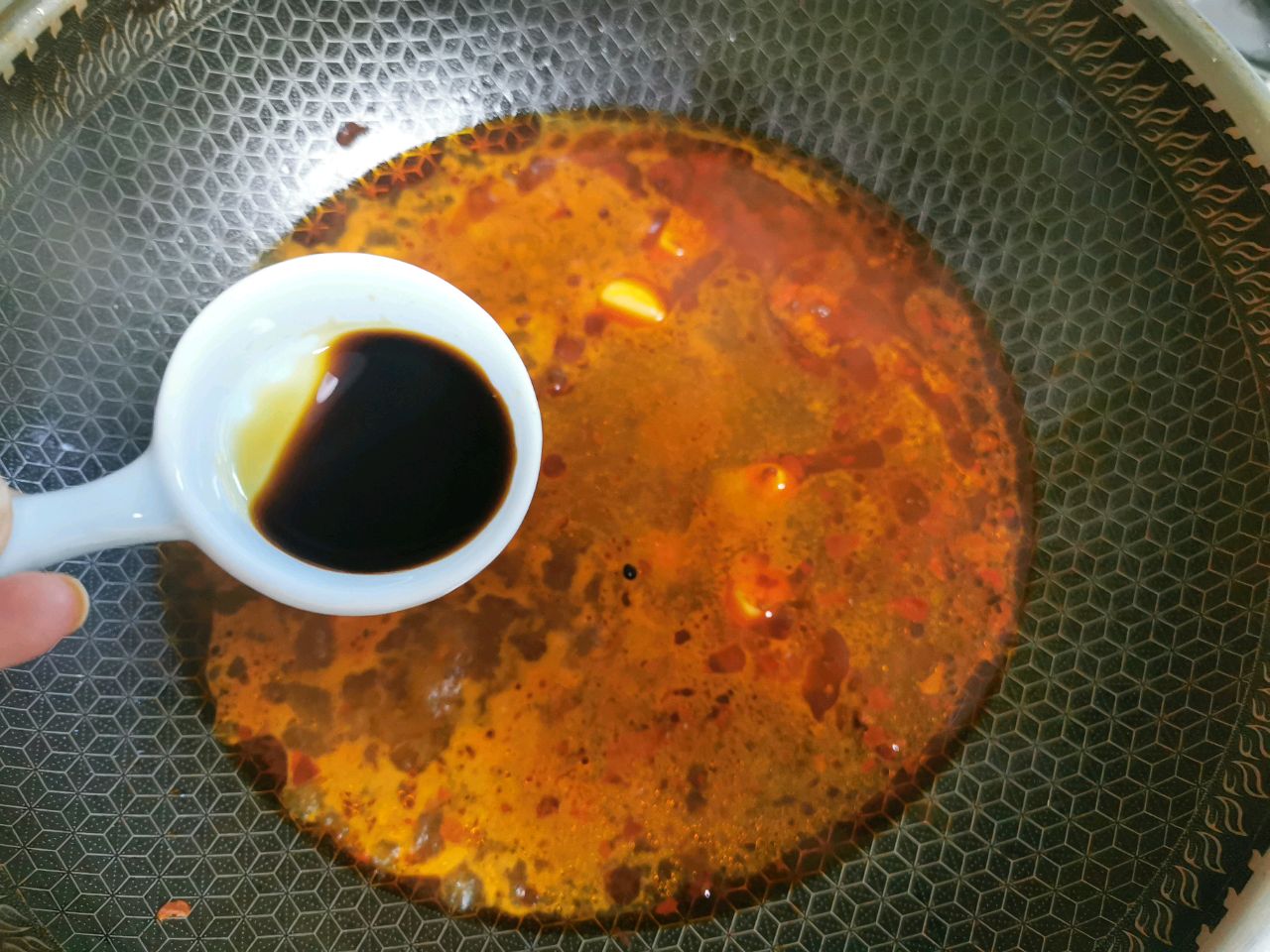 步骤11、倒进去郫县豆瓣酱,炒出红油