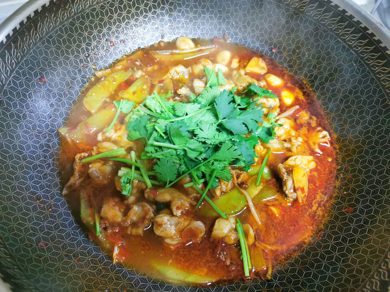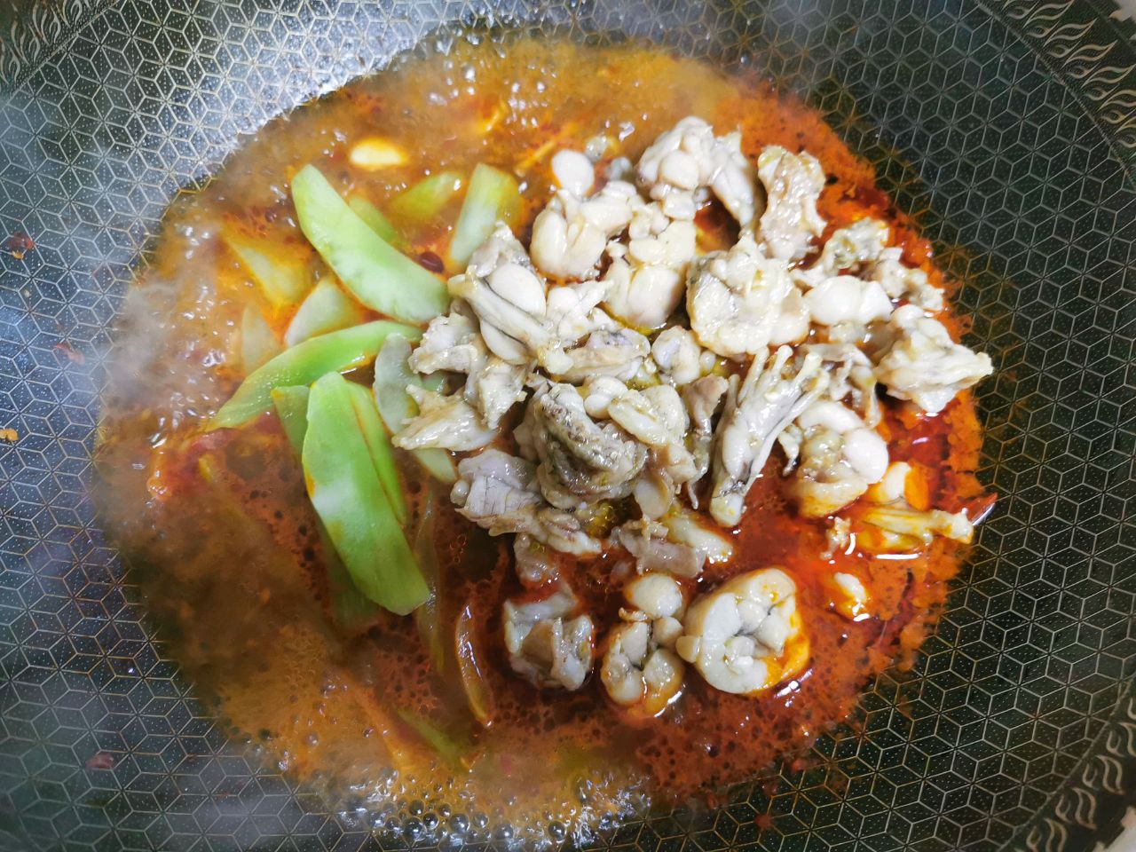 步骤18、汤里再放入莴笋和牛蛙煮开