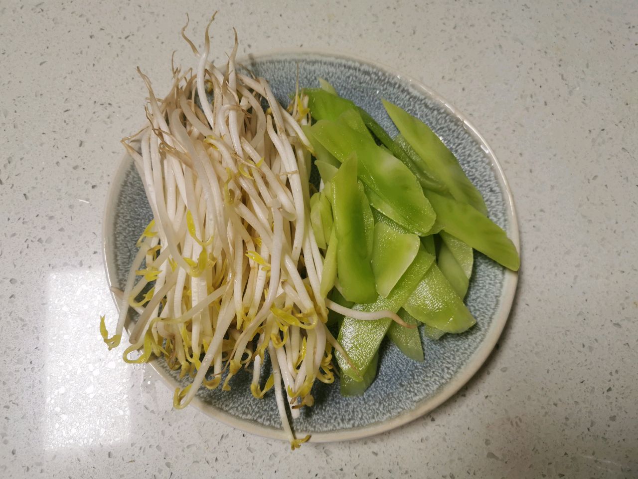 步骤5、洗好蔬菜,豆芽掐根,莴笋去皮切片
