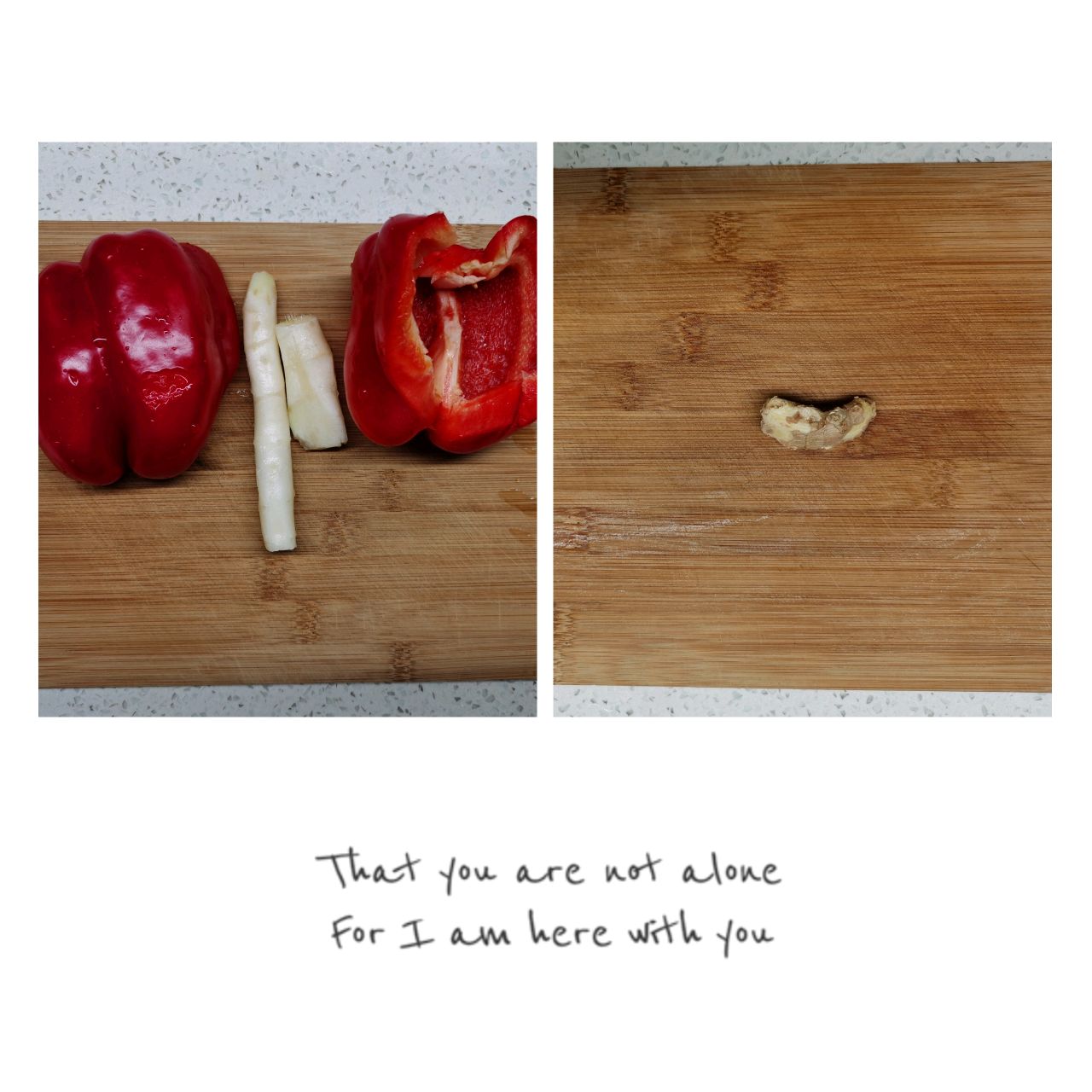 步骤2、食材处理。子姜切丝,灯笼椒切条,猪肉切薄片,姜蒜切末。