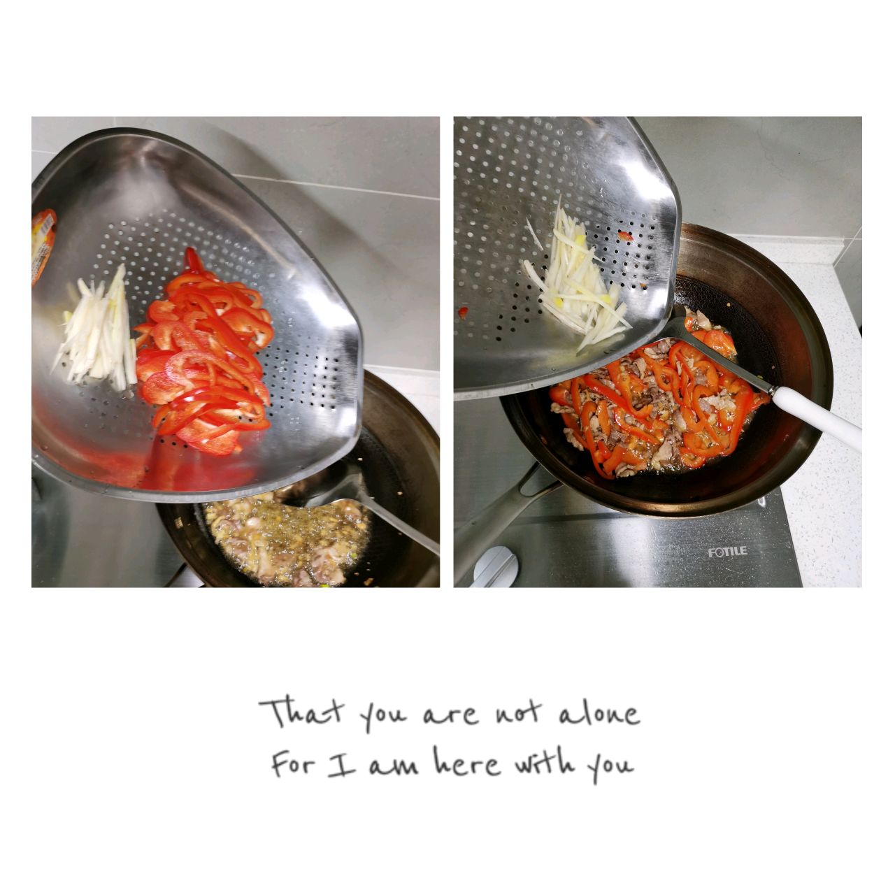 步骤4、先倒入灯笼椒炒至7分熟,再倒入子姜丝,大火翻炒。