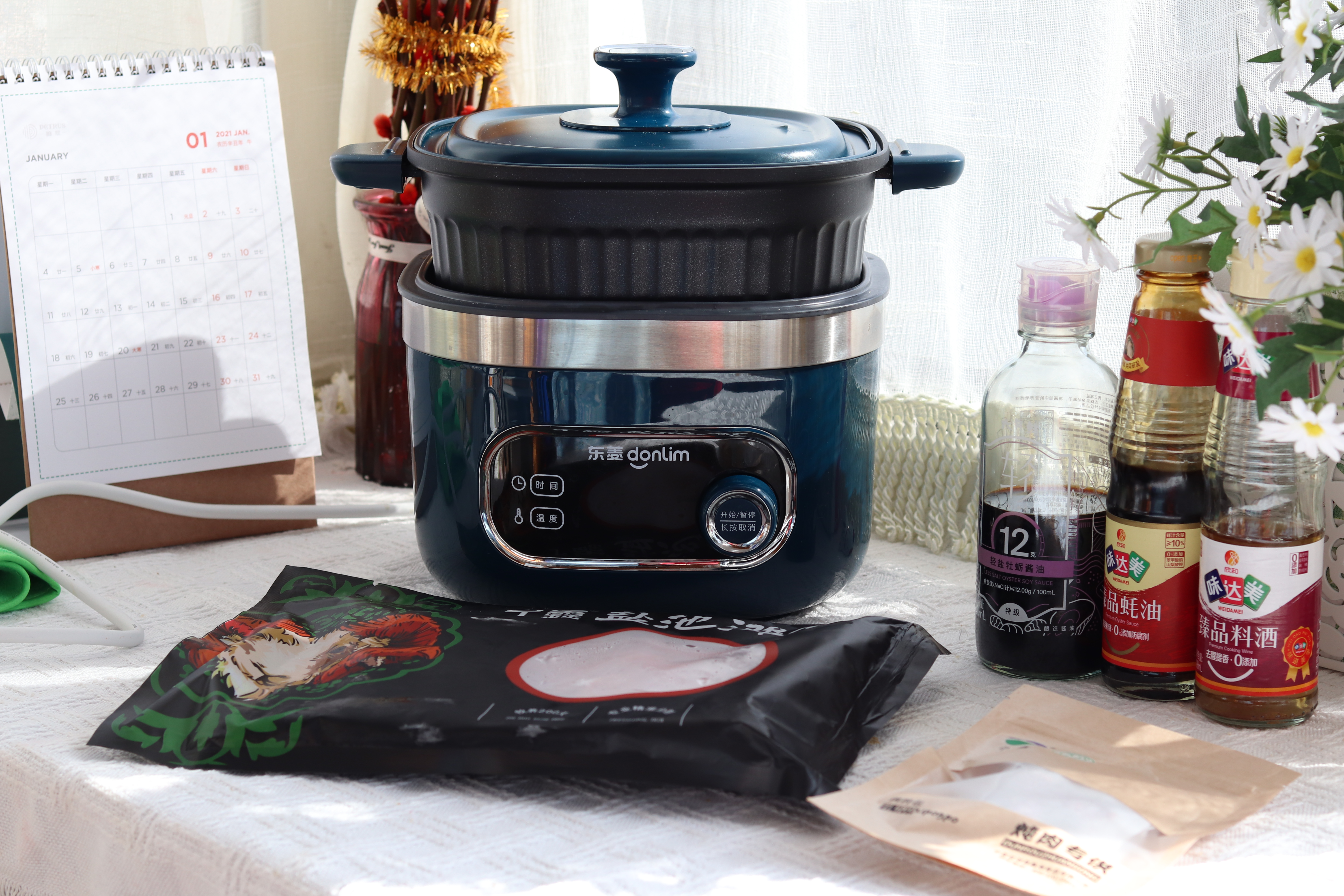 步骤4、设置成慢炖140度40分钟,到时间后,捞出料包跟姜片,再加入蚝油、生抽、盐调味,再盛出来一部分汤水。