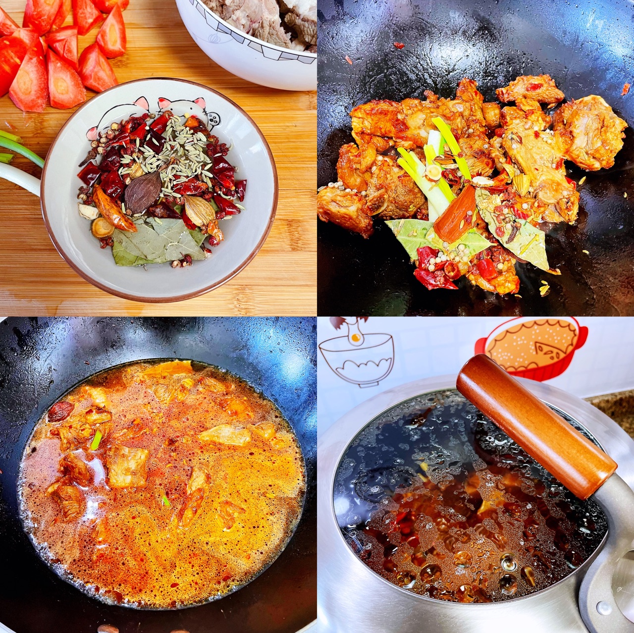 步骤1、羊肉提前泡去血水焯水洗净炒锅内加适量油,放砂糖炒糖色。小火哦。我用的新思特铁铝铁锅,受热特别均匀。如果你的炒锅受热不均匀炒糖色这一步需要观察状态适当晃动一下锅,让糖能够均匀焦化。焦糖色后倒入羊肉翻炒。再加一勺郫县豆瓣酱
