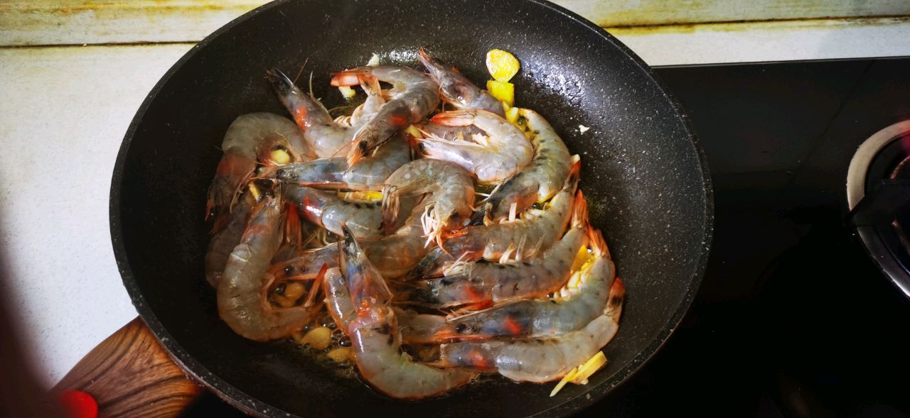 步骤3、要将虾壳爆透,然后加料酒。