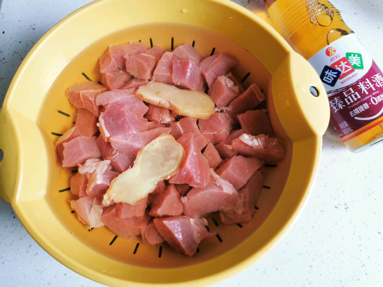 步骤1、牛肉切块加入料酒姜片泡去血水。