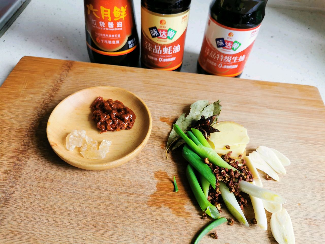 辅料:大葱1根、大蒜三瓣、姜1块、冰糖10克、八角香叶桂皮花椒如图所示、味达美臻品特级生抽40毫升、六月鲜红烧酱油30毫升、味达美臻品料酒80毫升、味达美臻品蚝油20克