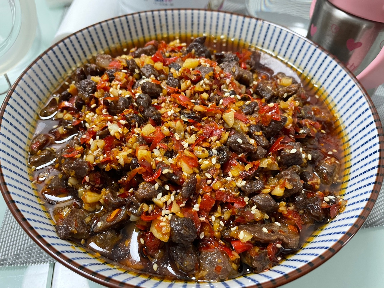 步骤1、牛肉切粒,适量孜然粉,五香粉腌制辣椒,蒜,姜剁碎放油,下辣椒待辣椒有干的迹象,放入腌制的牛肉