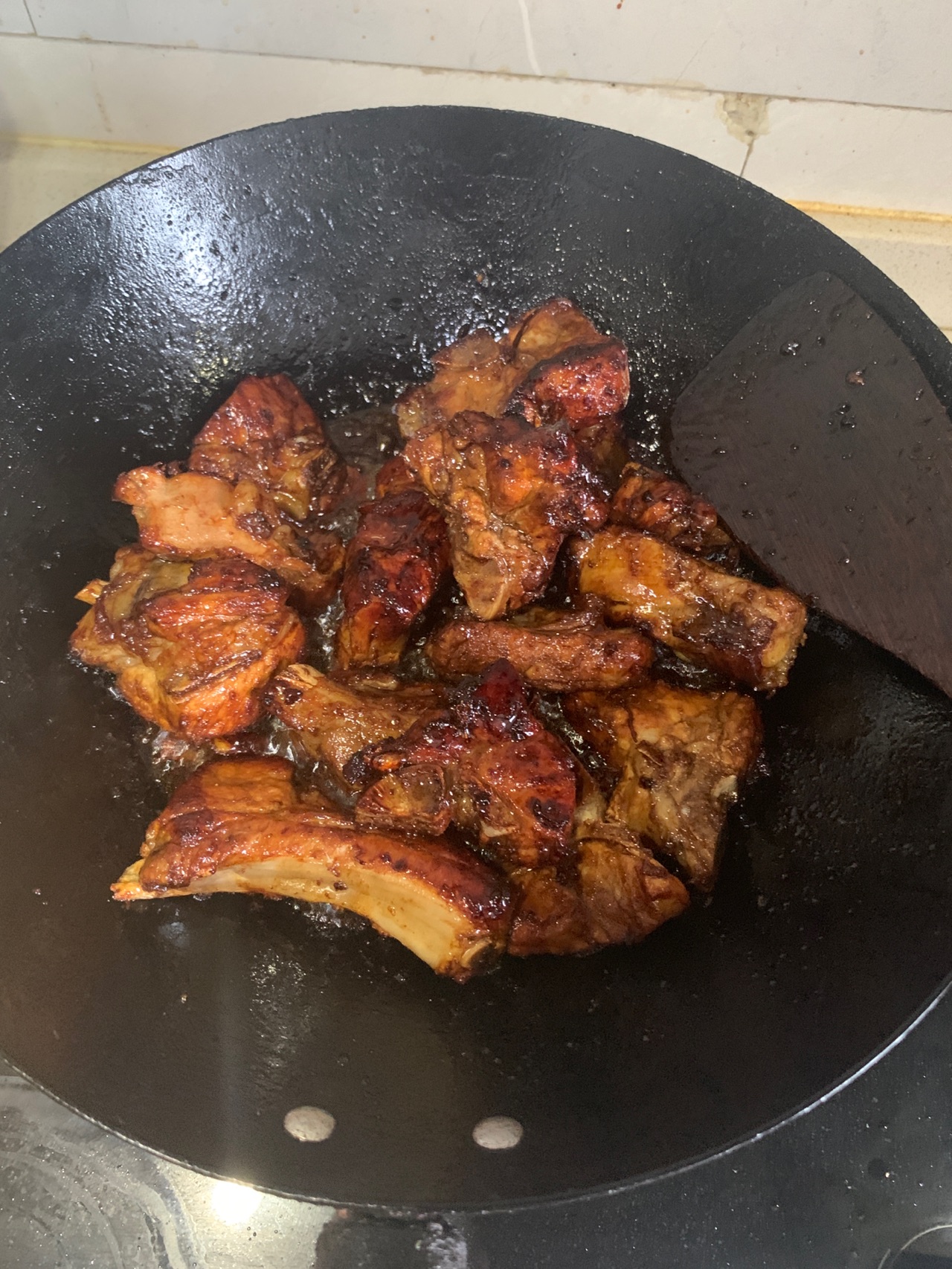 步骤5、冷油,加冰糖,小火把糖溶化,注意,千万控制火候和时间,糖化了就抓紧放肉,不要过了,糖糊了就会苦。加上老抽,翻炒,均匀上色