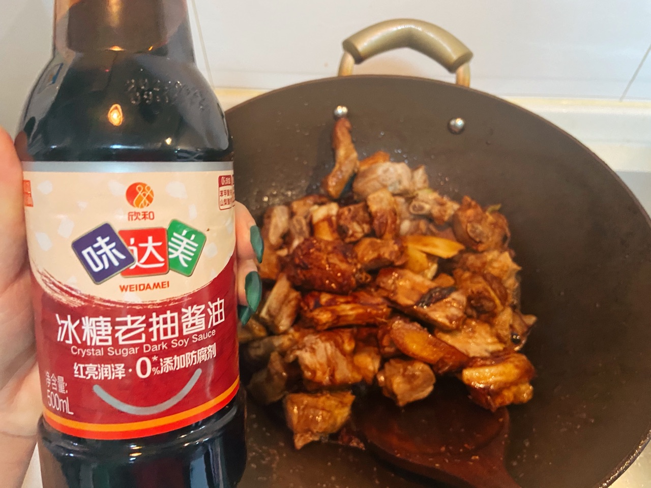 步骤4、加入三勺味达美冰糖老抽(不需要加盐和其它调味料),冰糖老抽上色非常好。