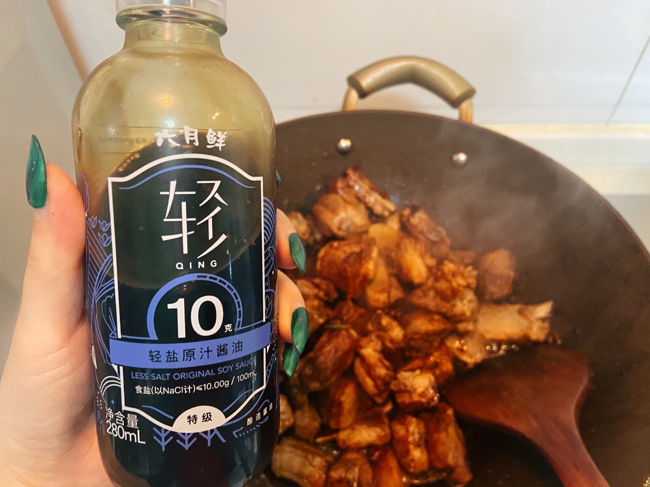 步骤5、加两勺六月鲜轻盐原汁酱油,少盐但是味道比较好。