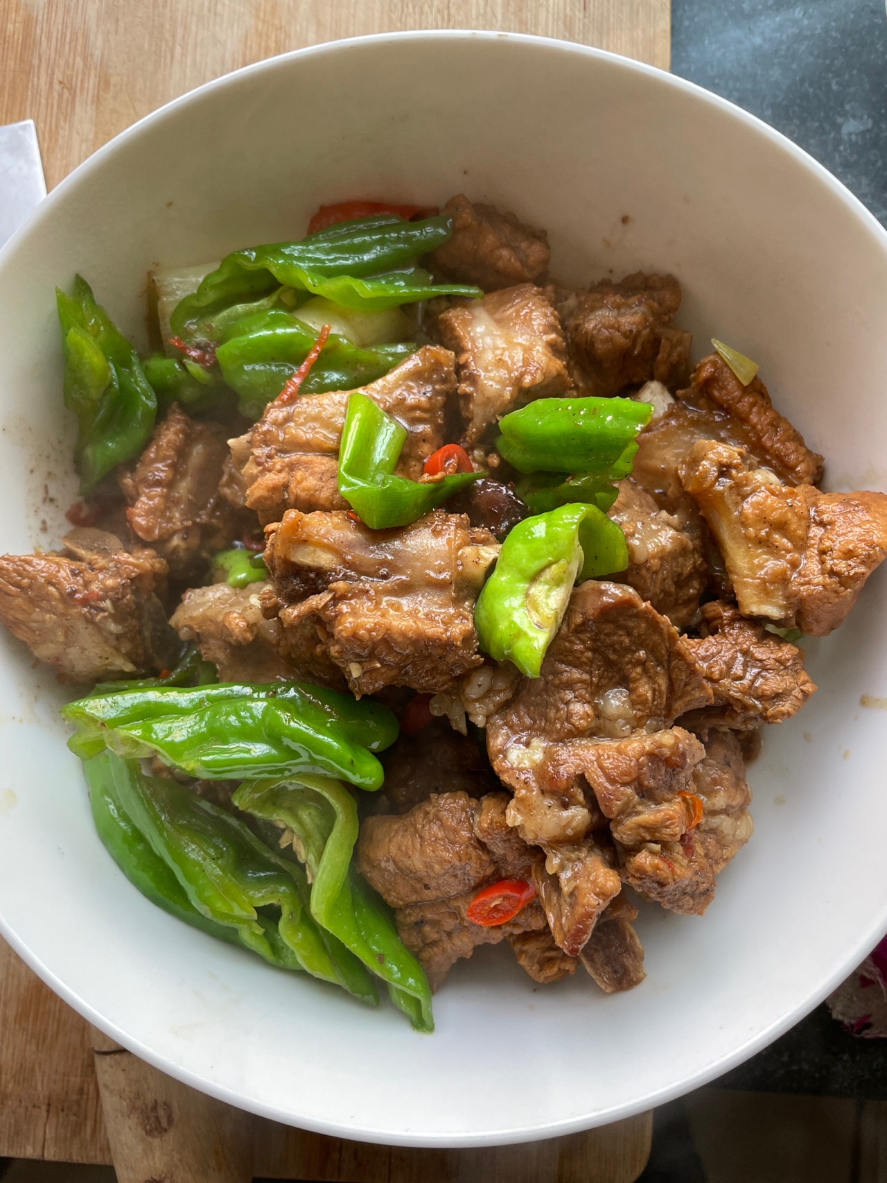 辅料:白砂糖2勺、八角1个、花椒适量、姜片适量、料酒1勺、生抽2勺、老抽1勺、青椒2个、葱段适量、小米辣4个