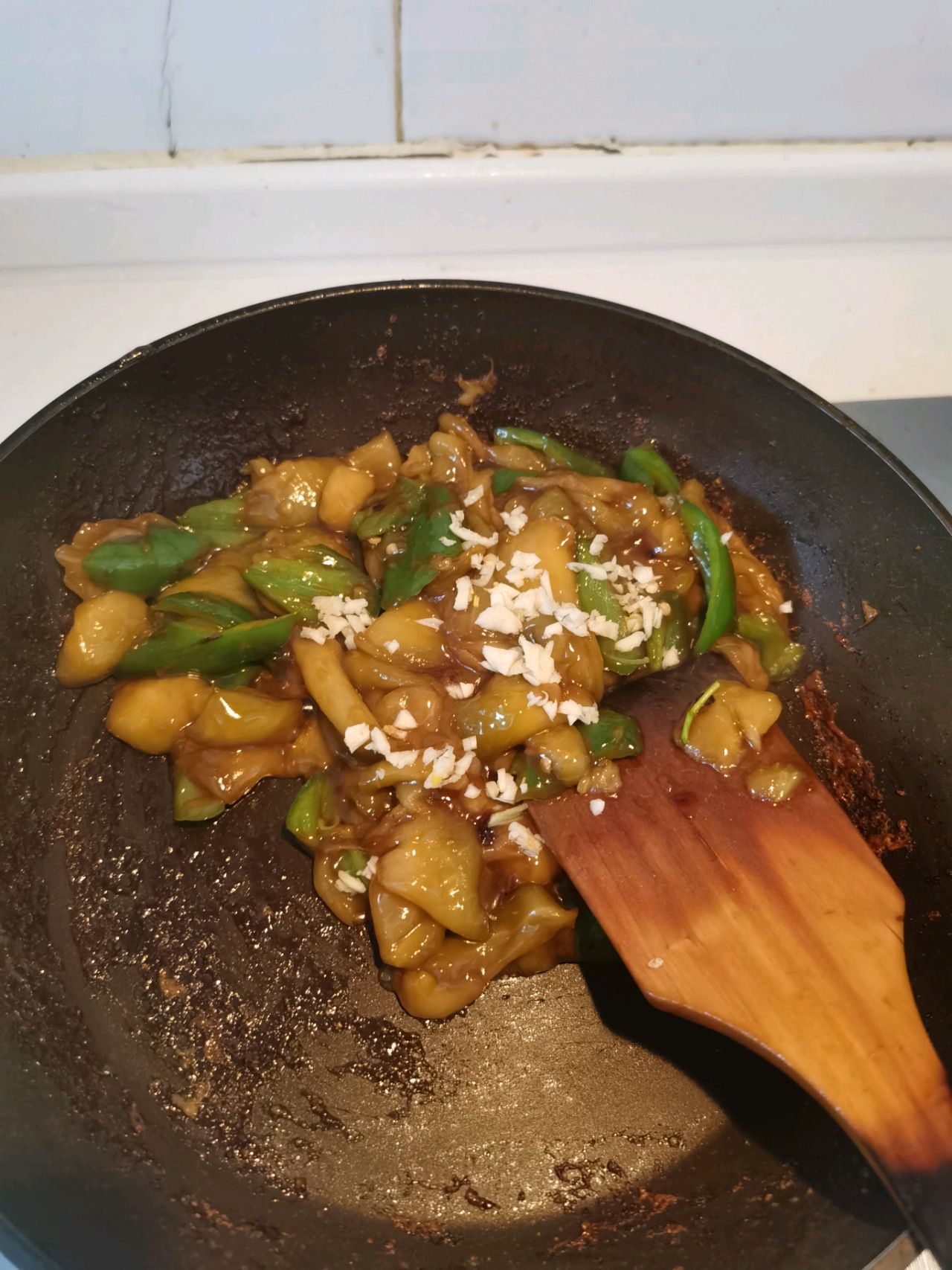 步骤7、导入料汁,翻炒最后加蒜出锅