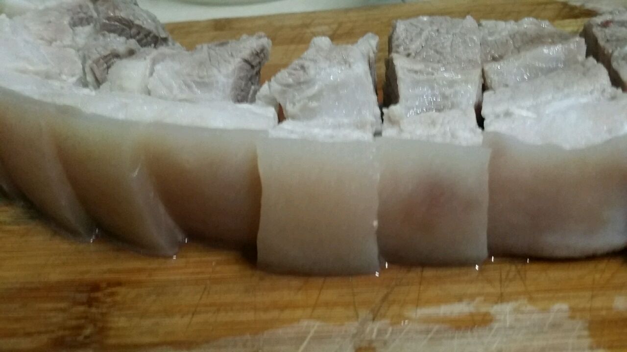 步骤3、3、选购正宗的土地猪五花肉,皮厚,肉紧而不柴,真的好吃,爽...
