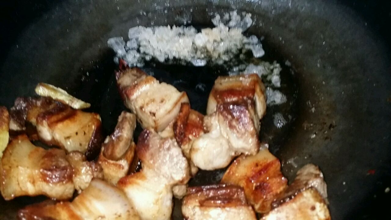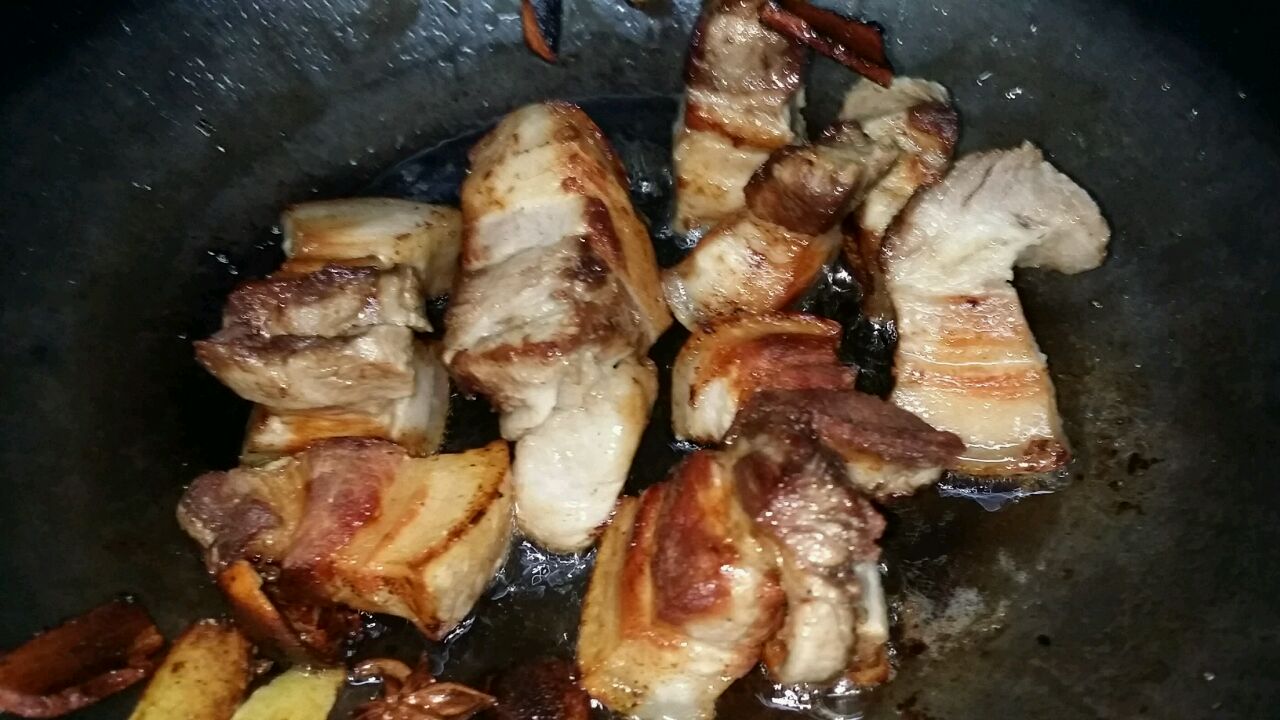 步骤5、5、起油锅,炒香配料,再煎香水煮的五花肉...