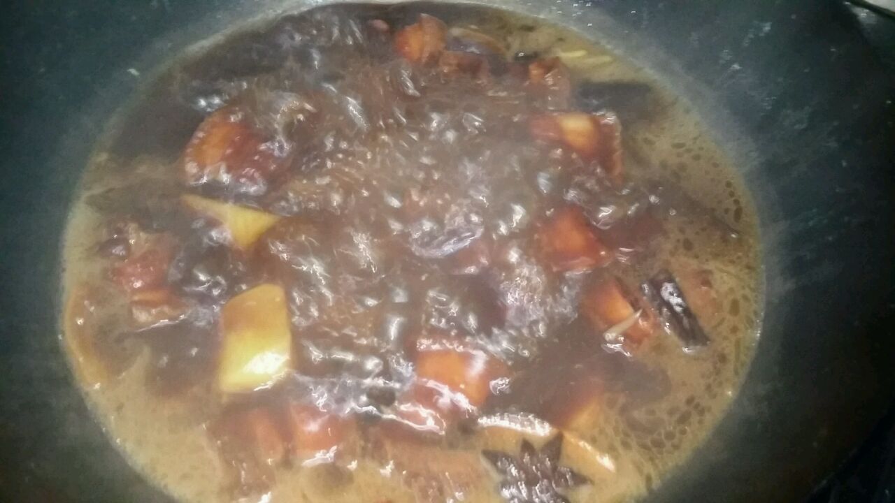 步骤8、7、加入清水过肉面,可以多加半碗水,同时加入老抽,味极鲜、白糖、料酒、土豆、洋葱心等,大火烧开30分,期间开锅搅拌后,转中小火,炖约45分钟,至汤汁变少...