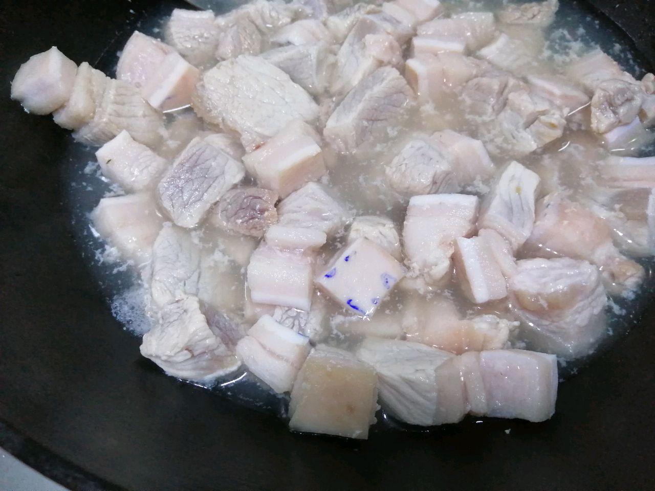 步骤3、炒锅加水烧开,放入切好的五花肉汆水,大约五分钟,捞出备用