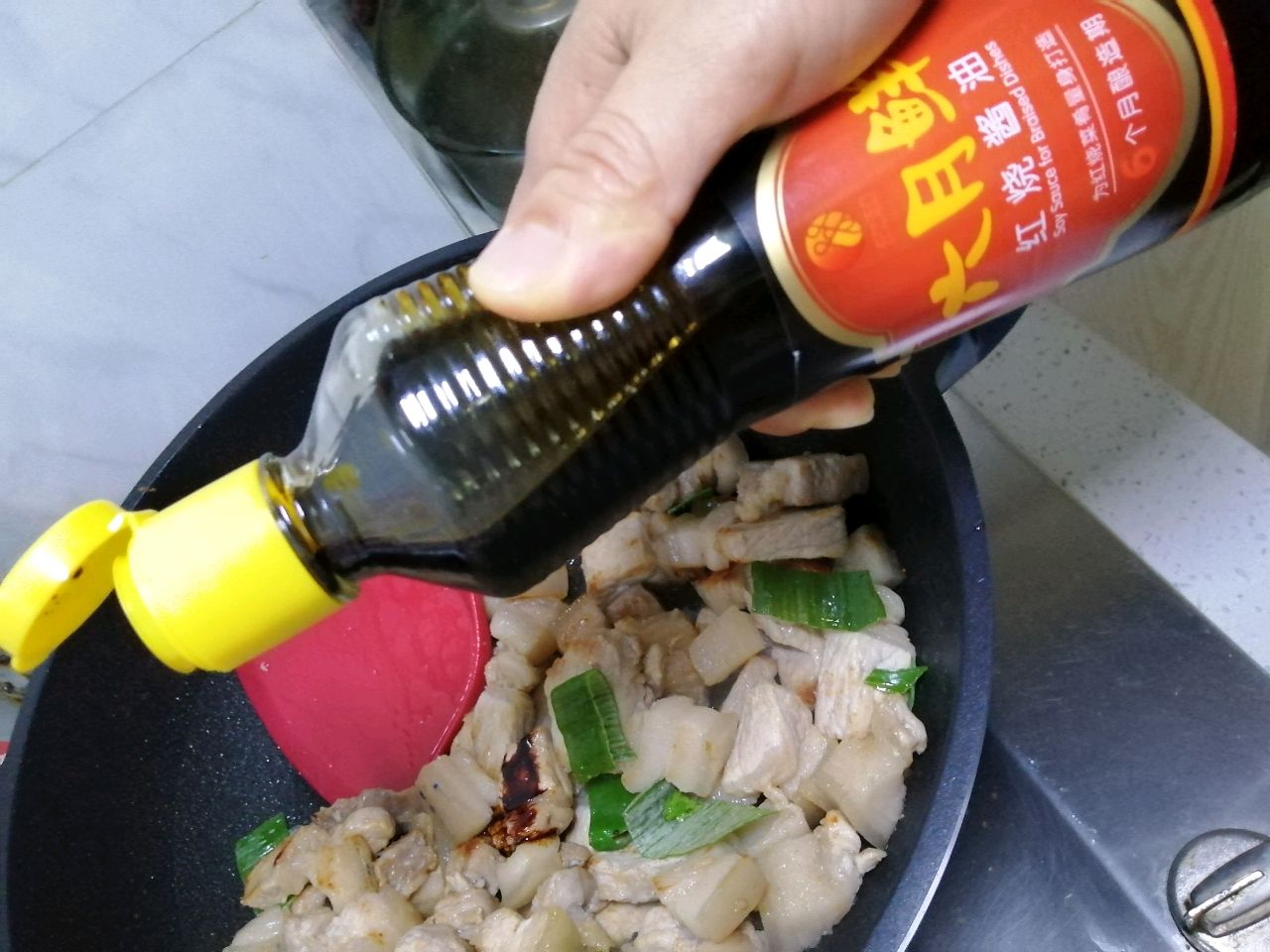 步骤4、炒锅入油,放入五花肉炒至微黄,加入红烧酱油,葱花,姜片