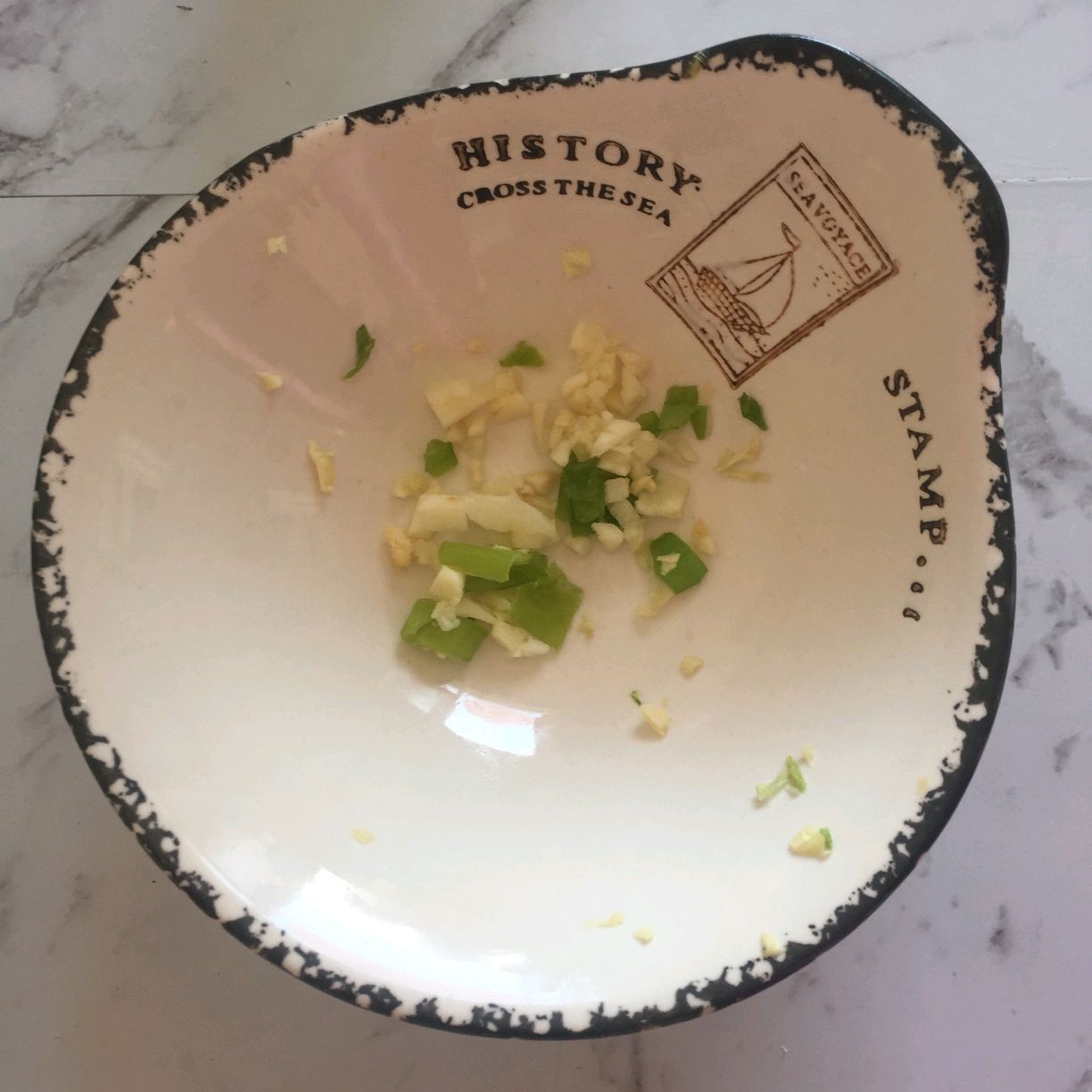辅料:老抽0.5勺、蚝油1勺、水1勺、葱蒜末500g一小把、椒盐一丢丢
