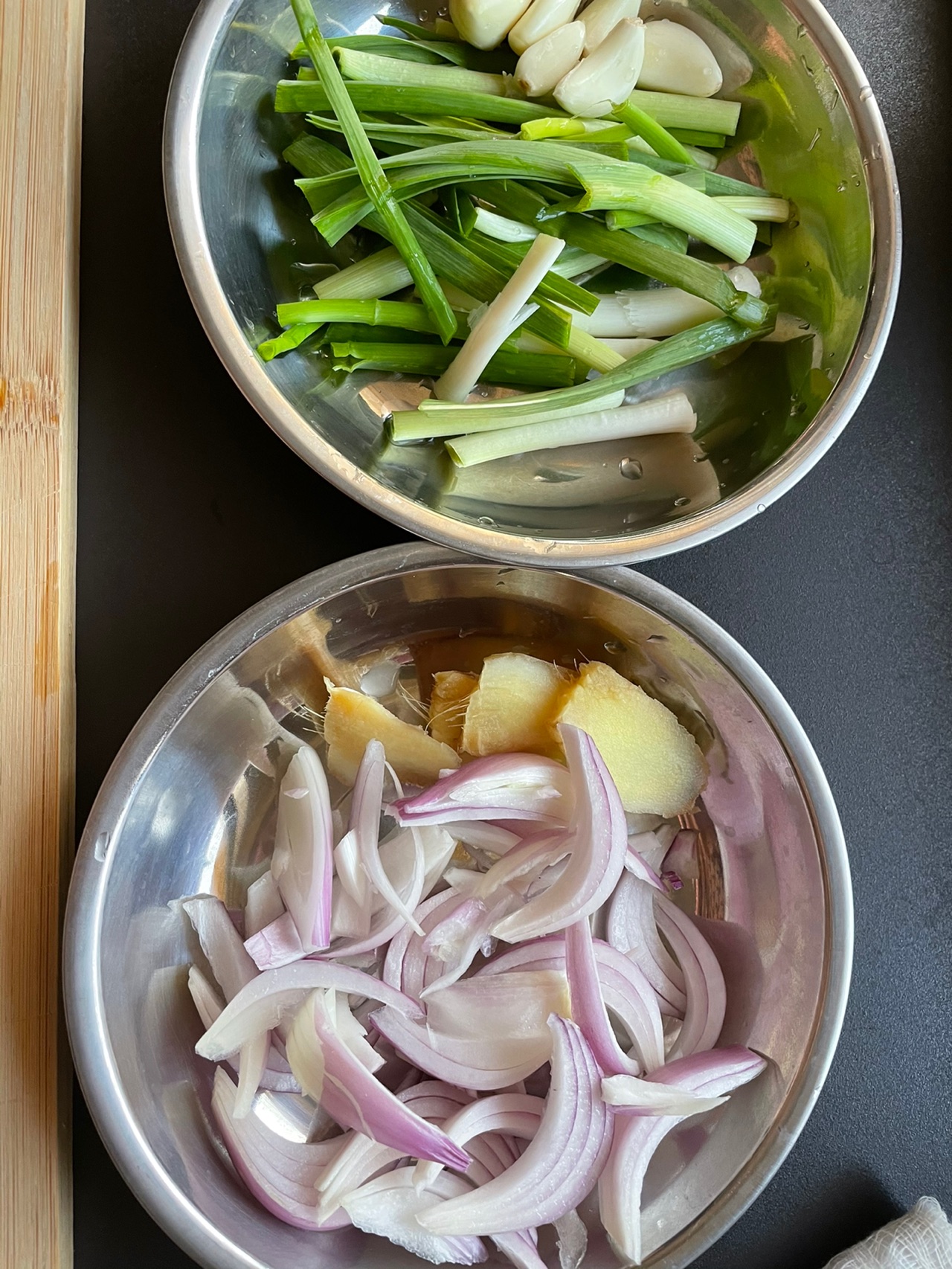 辅料:蒜5-6瓣、糖2克、美极鲜味汁适量、红烧汁3勺、盐适量、陈醋2茶匙、啤酒1罐、植物油适量、香葱3根、蒜段3根、洋葱半个
