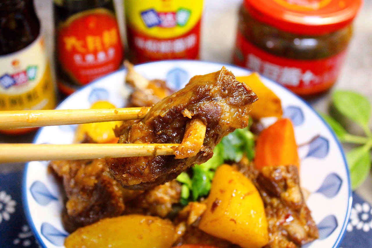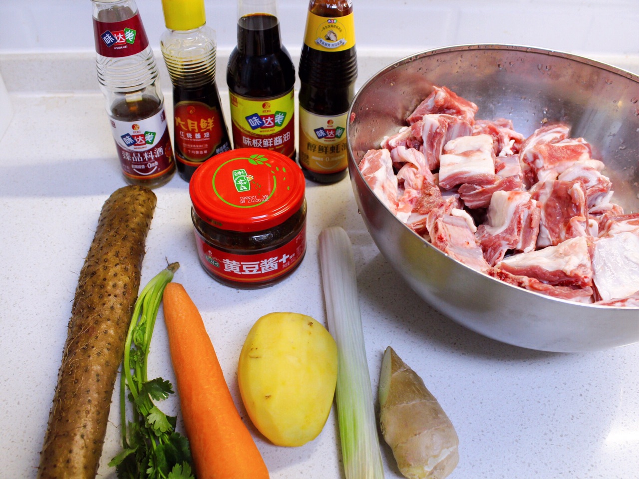 辅料:姜1块、香料包1包、六月鲜红烧酱油2勺、味达美臻品料酒2勺、味达美醇鲜蚝油2勺、味达美味极鲜酱油2勺、葱伴侣辣味黄豆酱2勺、盐10克、糖10克、山药半根、胡萝卜1根、土豆1个、香菜1根