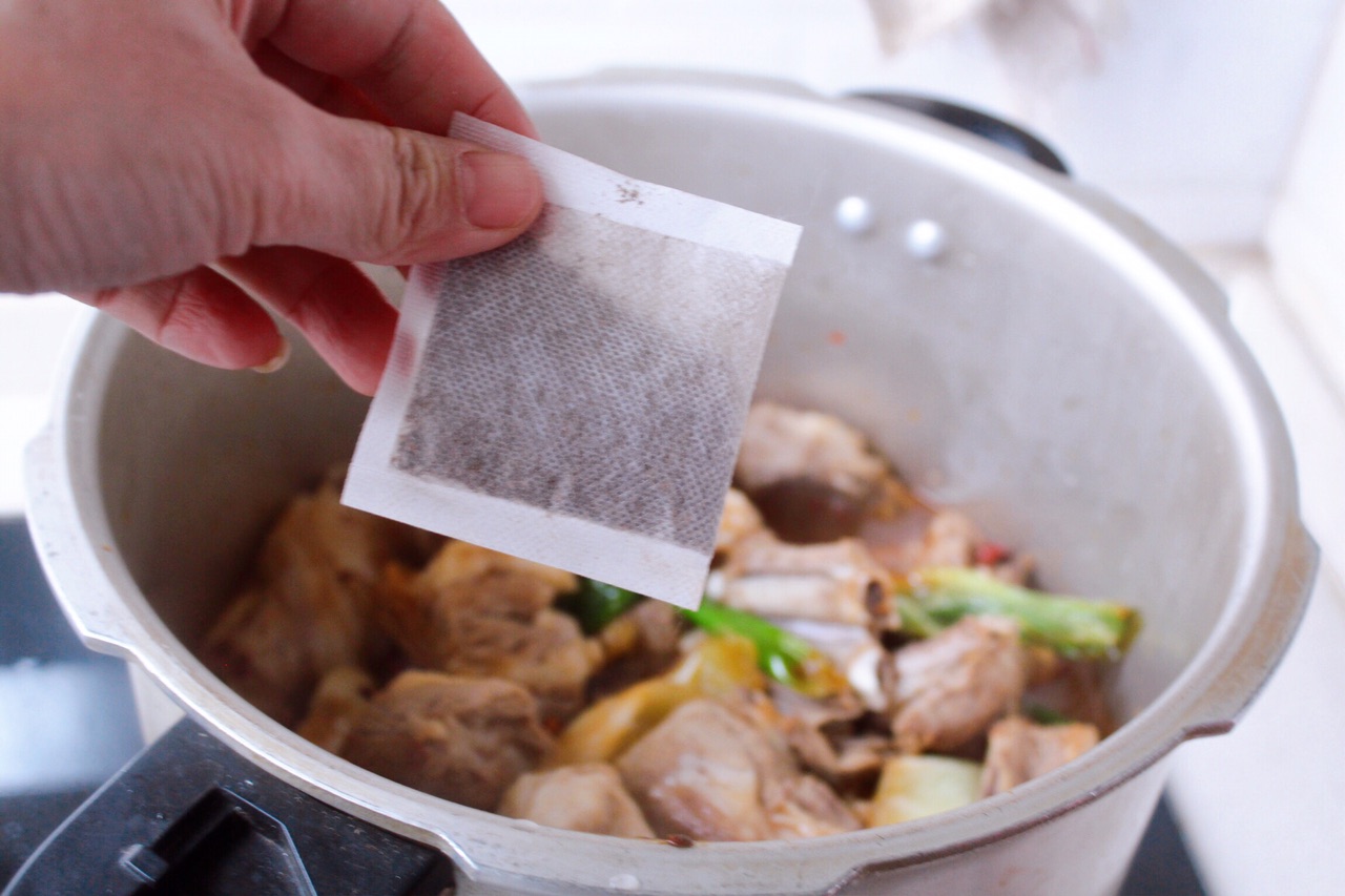 步骤10、将锅里的所有的食材汤汁一同倒入高压锅中,放入一袋香料包;