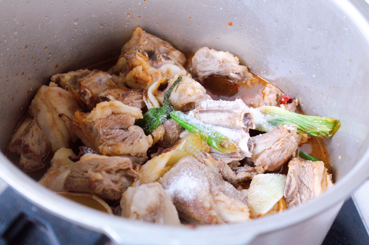 步骤9、一起炒匀后,倒入开水与羊排持平的水位;
