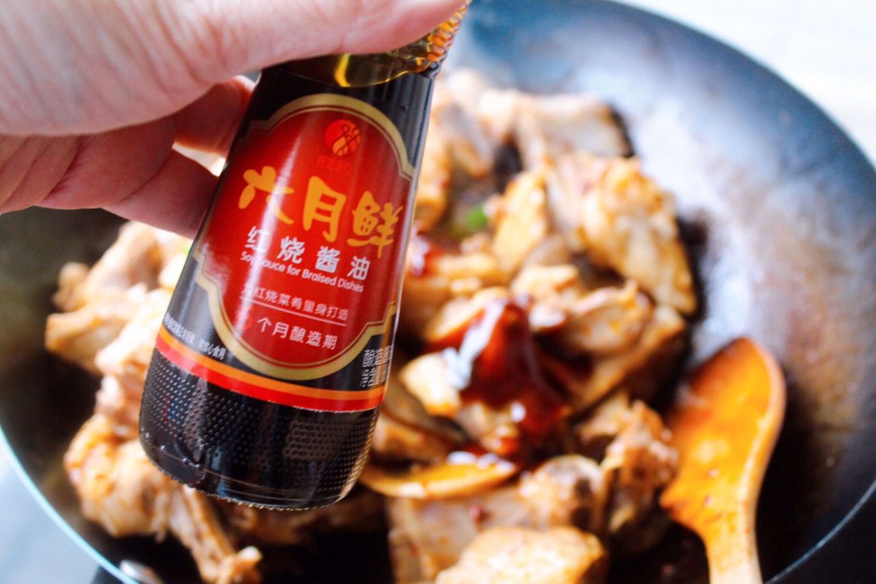 步骤7、再加入六月鲜红烧酱油2勺,味达美醇鲜蚝油2勺;