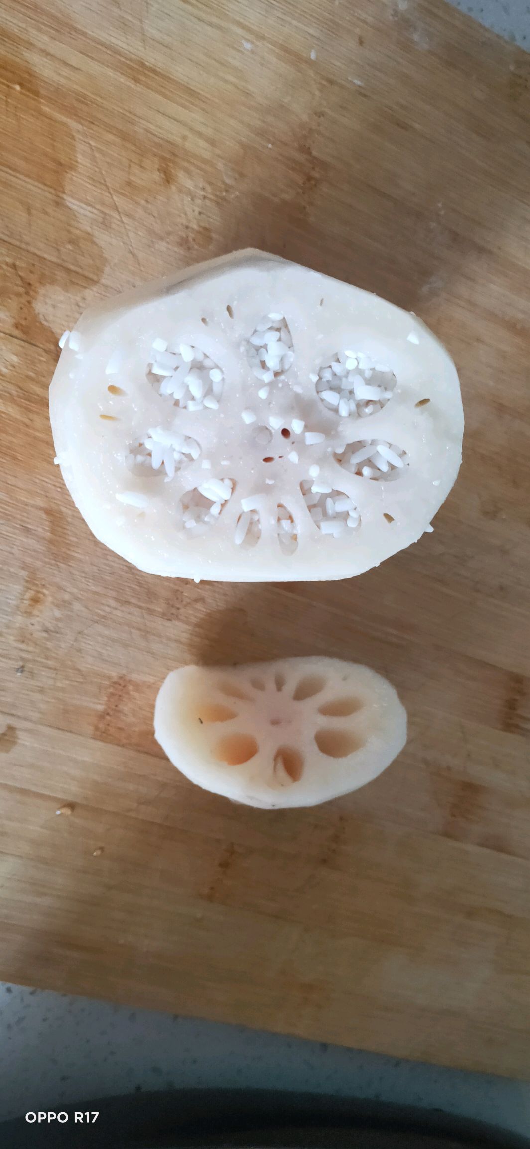 步骤1、糯米提前泡一晚上,莲藕切掉一头,然后利用筷子把米粒填满!这是个耐心活!