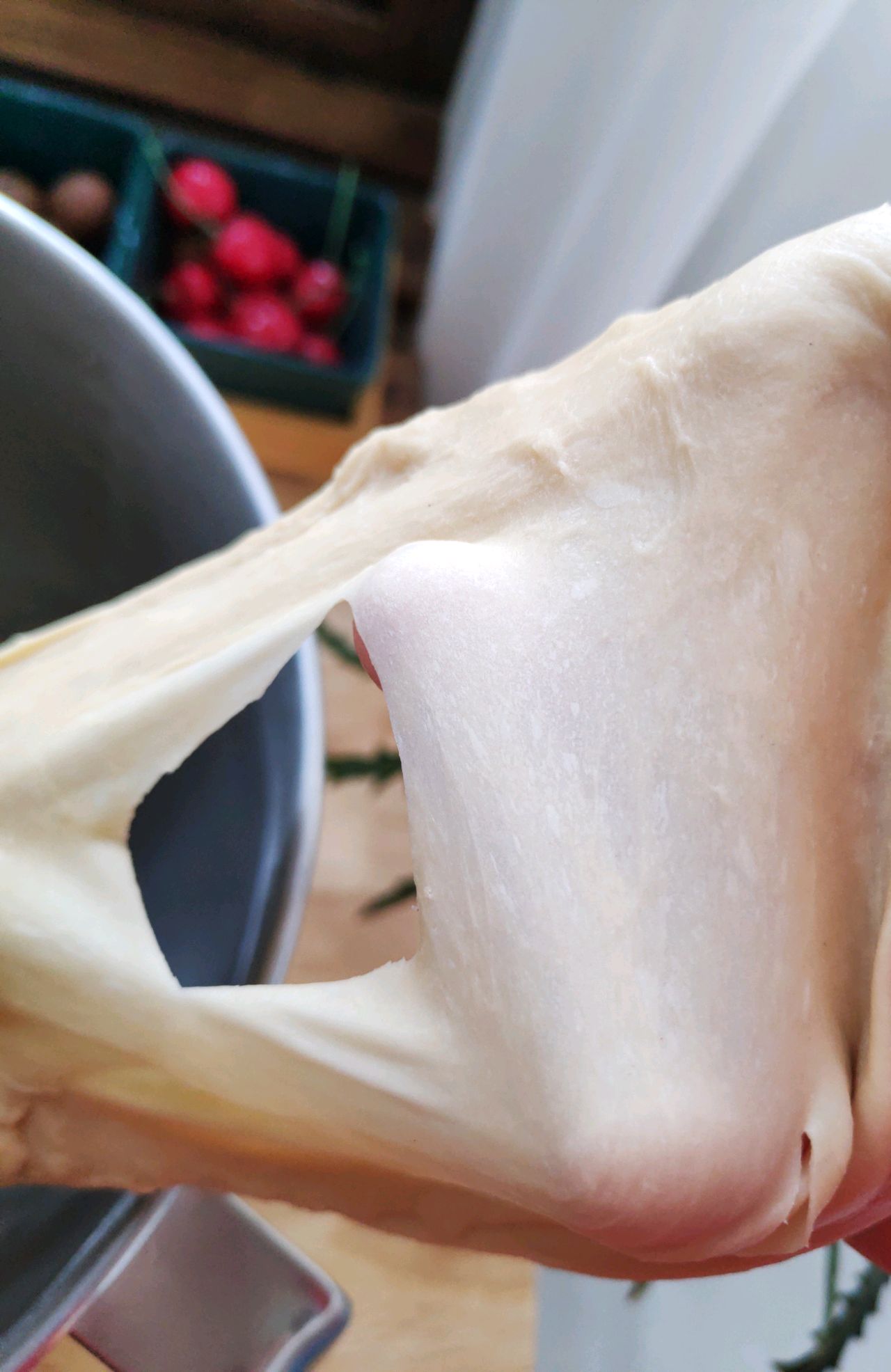 步骤4、黄油和面团完全融合之后,调高速打面5-7分钟,这个时候可以拉出薄薄的一层手套膜。