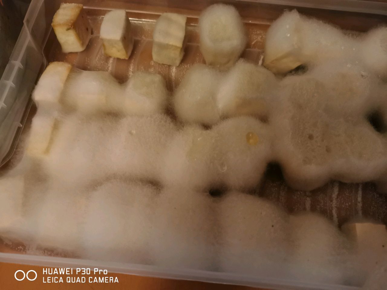 步骤1、1.准备老豆腐一块,将豆腐切成4-5厘米左右的方块。2.将切好的豆腐放入空置的篦子上,将腐乳曲均匀的撒在上面,(腐乳曲一包8g,可以做五斤,根据自己做豆腐的多少来加)3.将处理好的豆腐放在20℃以上的室内,用保鲜膜盖好,进行发酵。发酵2-3天基本就好了。