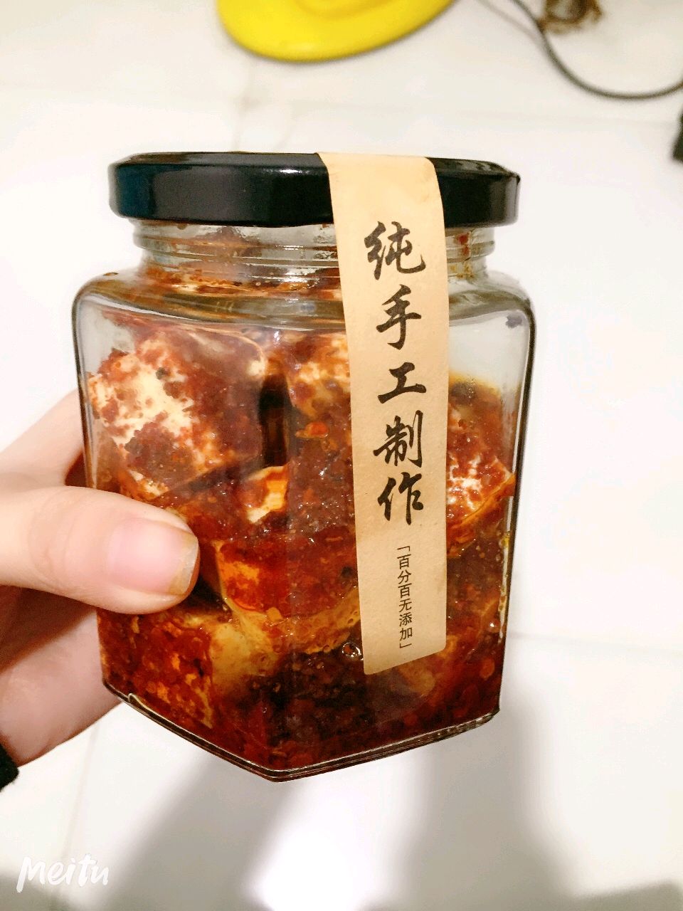 步骤3、1.给发酵好的毛豆腐沾上准备好的白酒,然后在裹上一层辣椒调料,口味重的可以多裹一层,然后放入玻璃瓶中。2.瓶子装到七分满时,将晾好的热油,浇到做好的豆腐乳上面。然后封口,防止在阴凉的地方腌制15天左右就可以享用啦!