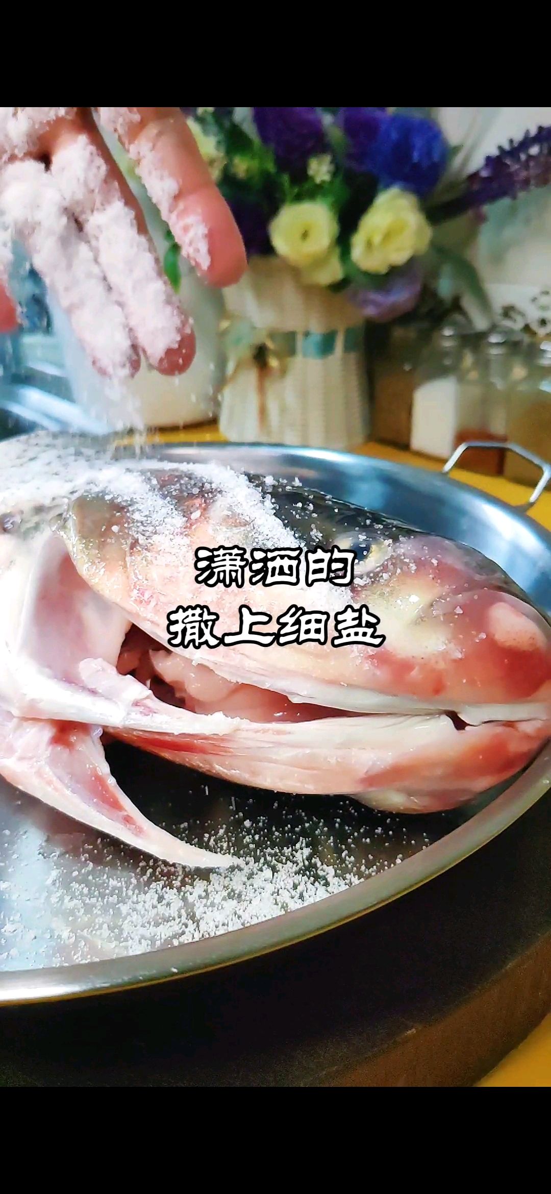 步骤1、鱼头切半不切断,清洗干净抹盐,加入料酒,生抽和蒸鱼豉油腌制半个小时。
