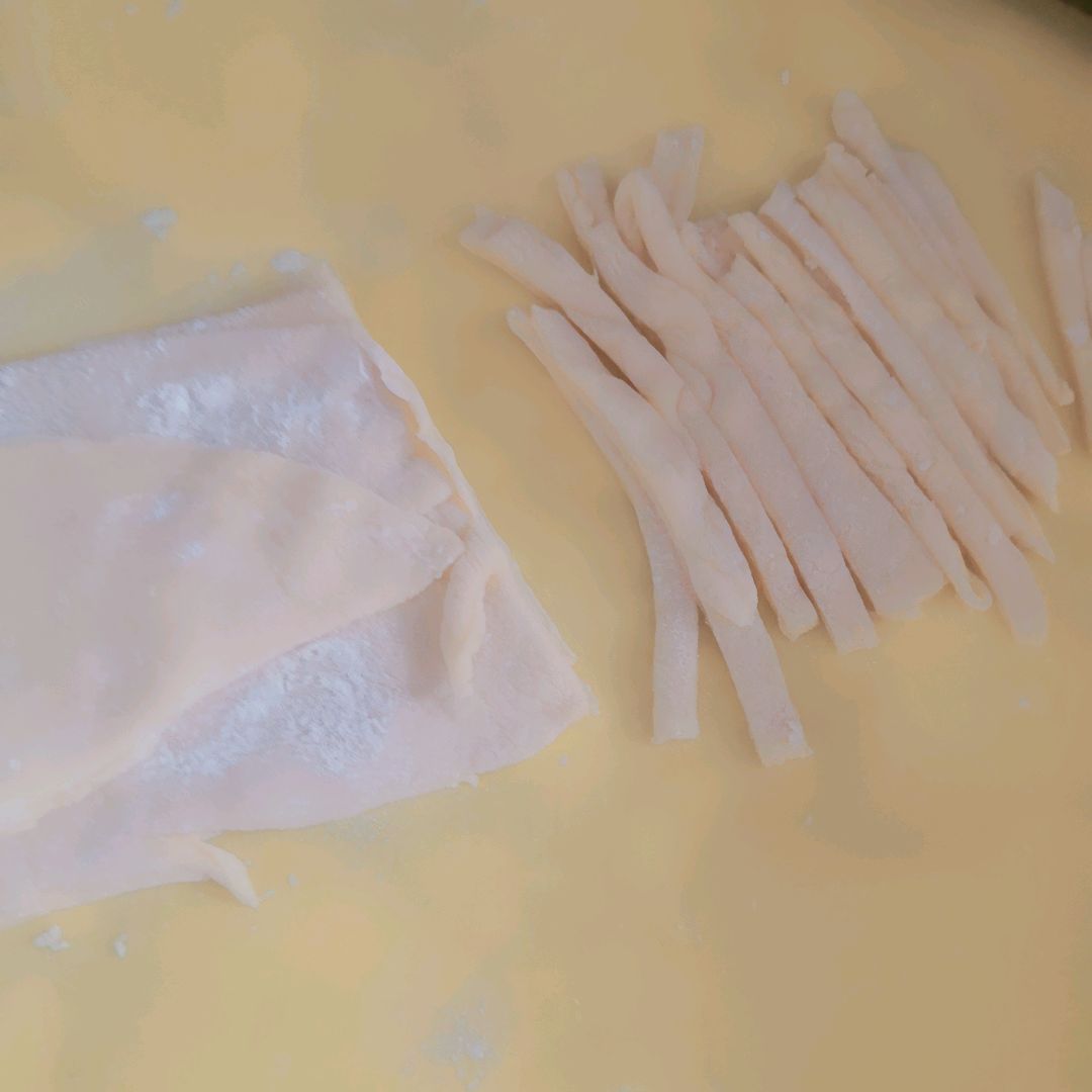 步骤7、切成四片,撒上干面粉摞一块,切成小细条。