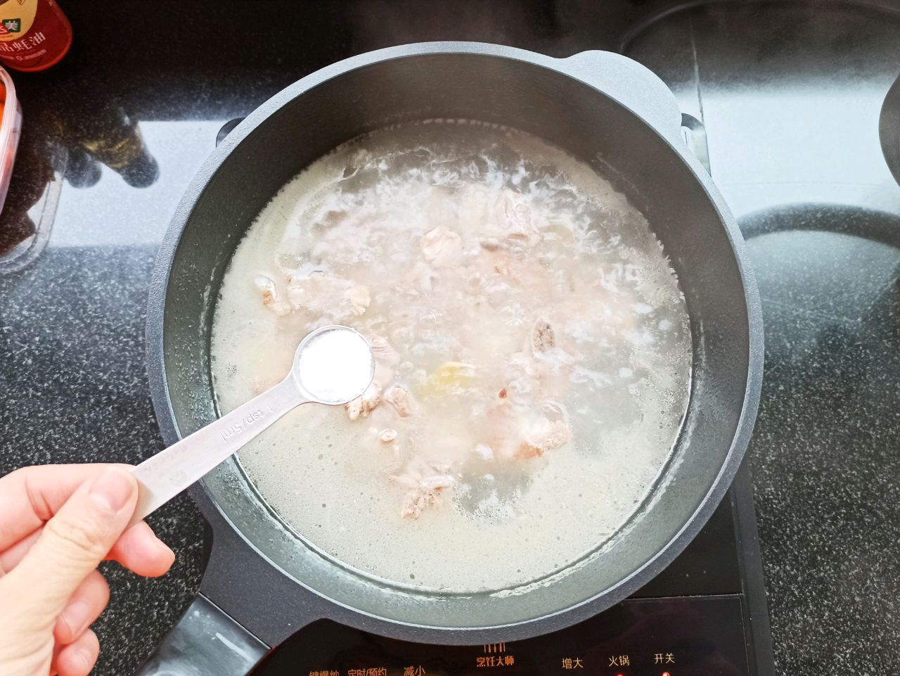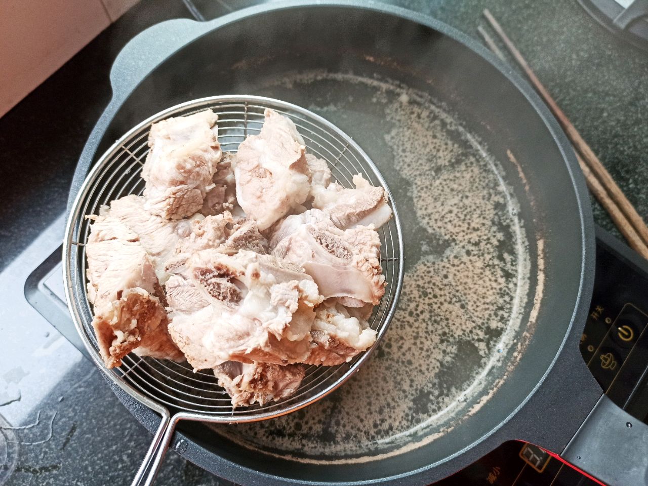 步骤3、水开后再煮5分钟左右,去除浮沫,捞出排骨待用。