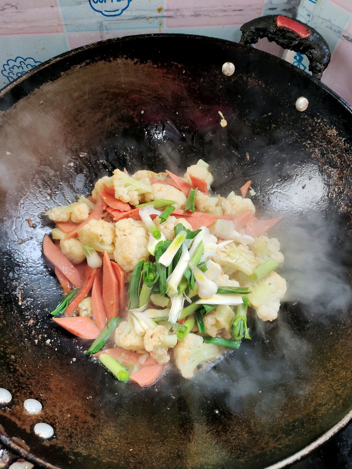 步骤1、花菜掰成小朵洗净沥干水分,火腿肠切成块,蒜苗切成段备用!